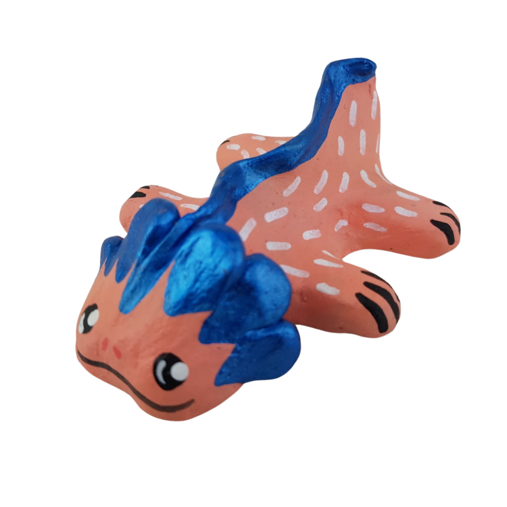 Esta artesanía fue elaborada con la técnica de barro policromado en Tlaquepaque, Jalisco, por la artesana Irma Arce. Es un simpático ajolote, especie endémica de Xochimilco en la Ciudad de México.