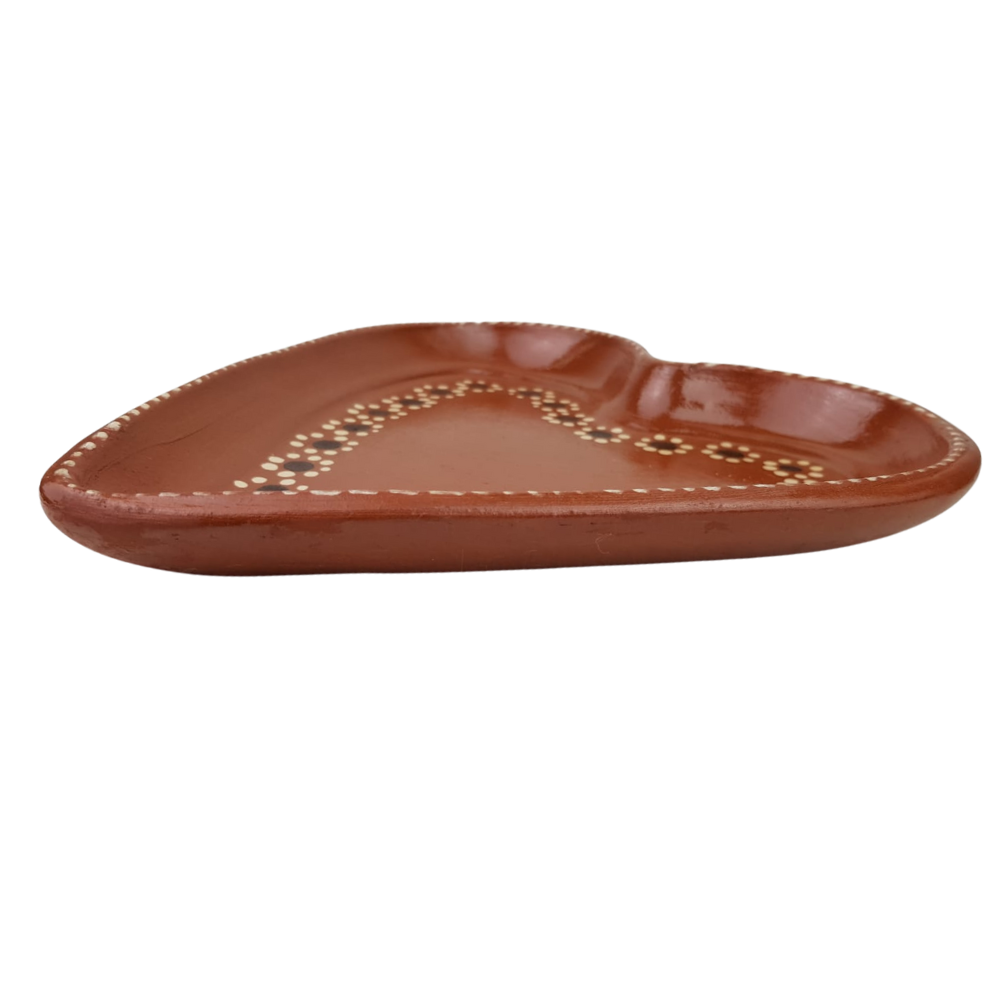 Hermoso plato elaborado en barro capulineado por María Inés. Esta original plato fue decorada a mano con la flor de capulín. Este característico estilo de decoración, le da el nombre de barro capulineado a la técnica empleada para la creación de estas bellas artesanías de Michoacán.