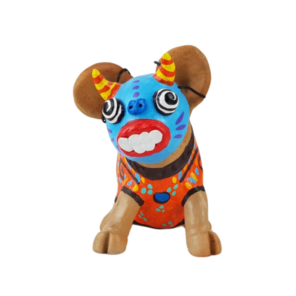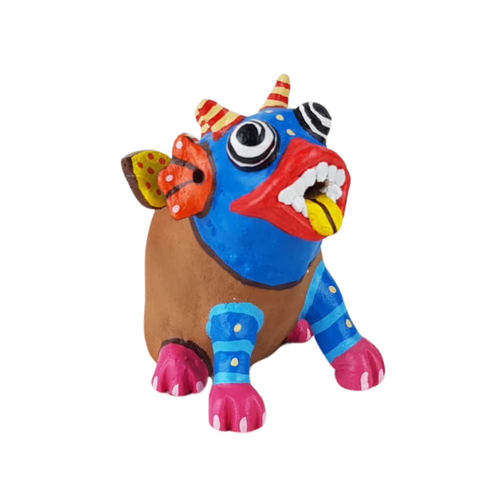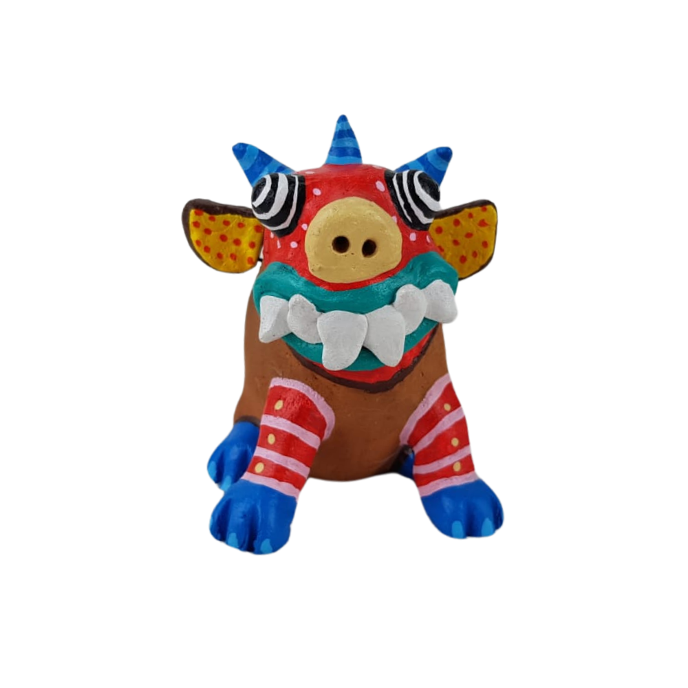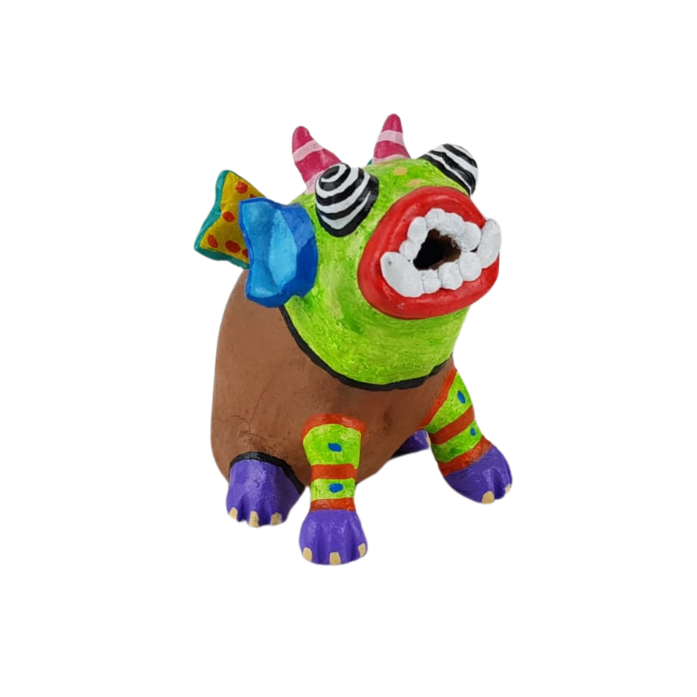 Esta artesanía mexicana es realizada por el maestro alfarero Cesar Lucano, empleando la técnica de barro policromado frío y combinando elementos tradicionales con innovación.