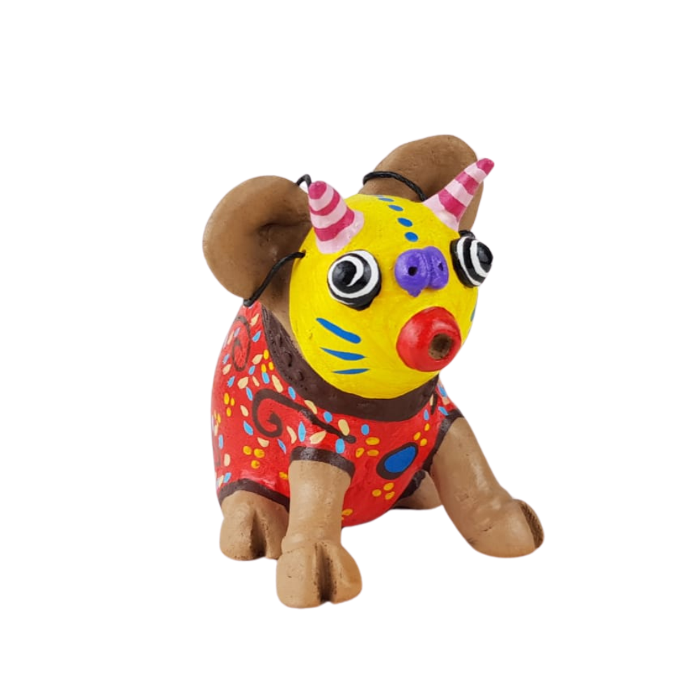 Curiosa alcancía en forma de cerdito. Esta increíble artesanía fue moldeada conservando la forma tradicional del cerdito sentado, pero agregando una divertida máscara que le da un toque moderno a la pieza; o el nahual, cuya caracterización no es desmontable.