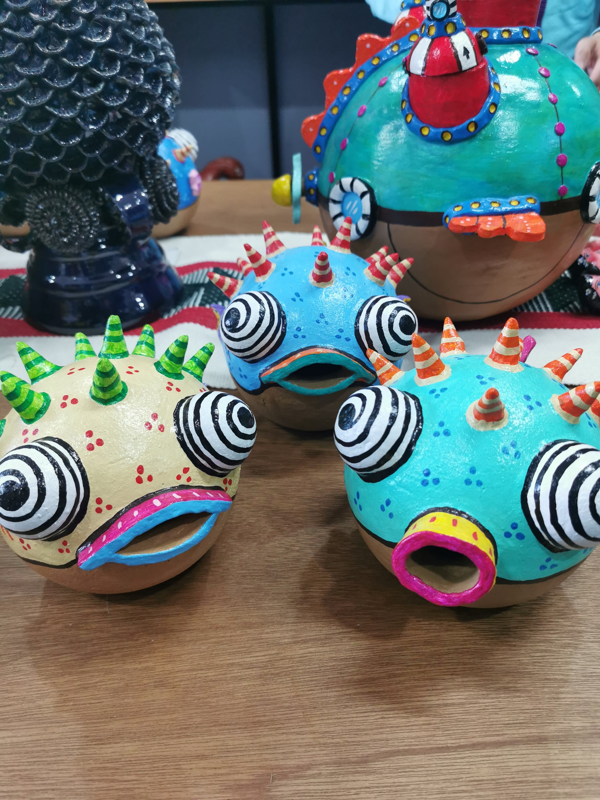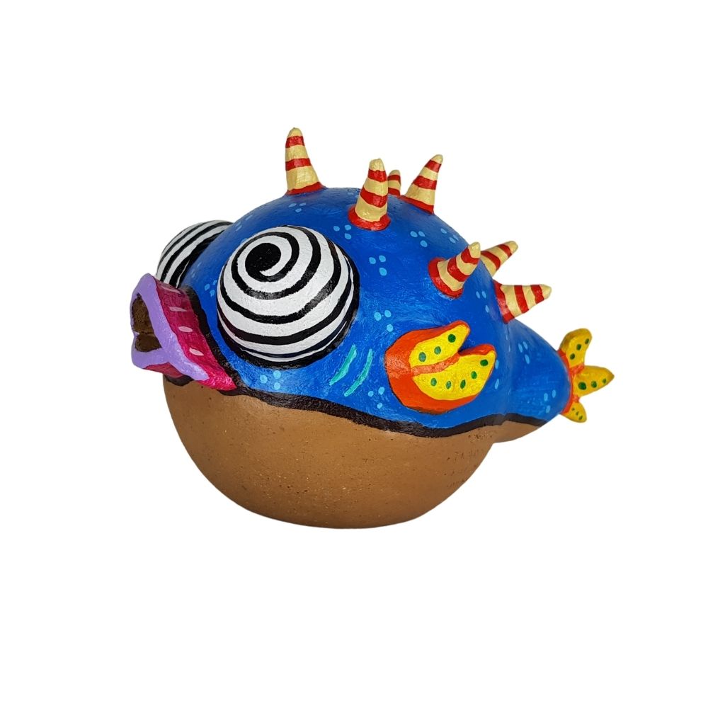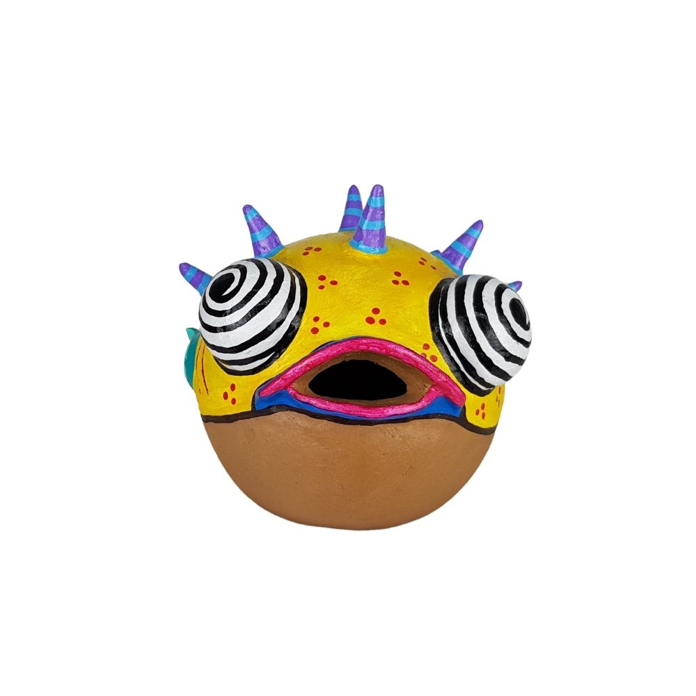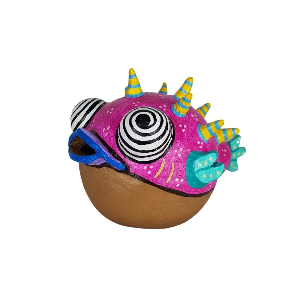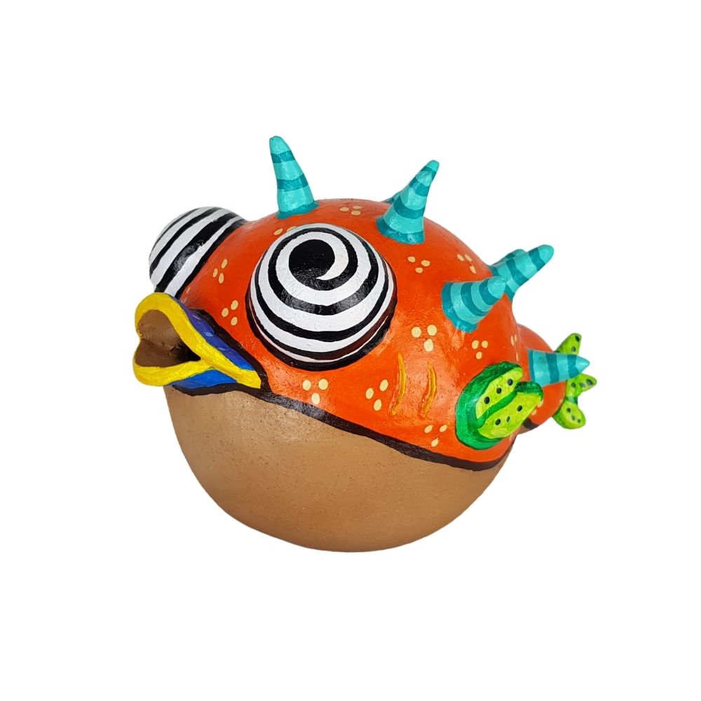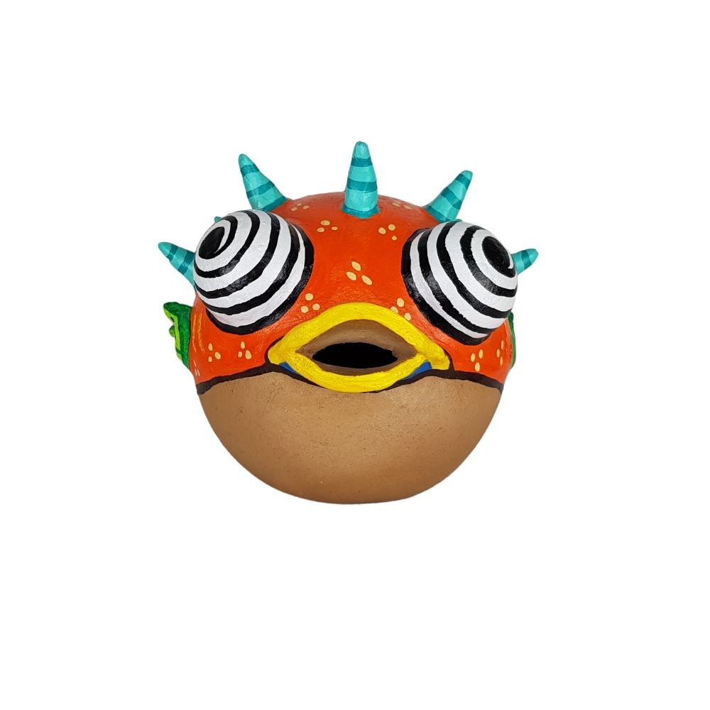 Curiosa alcancía de pez globo, realizada por el maestro alfarero César Lucano, empleando la técnica de barro policromado frío y combinando elementos tradicionales con innovación.