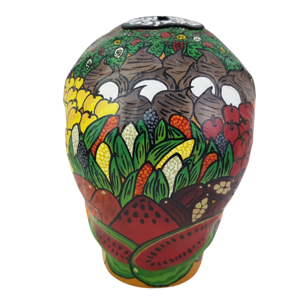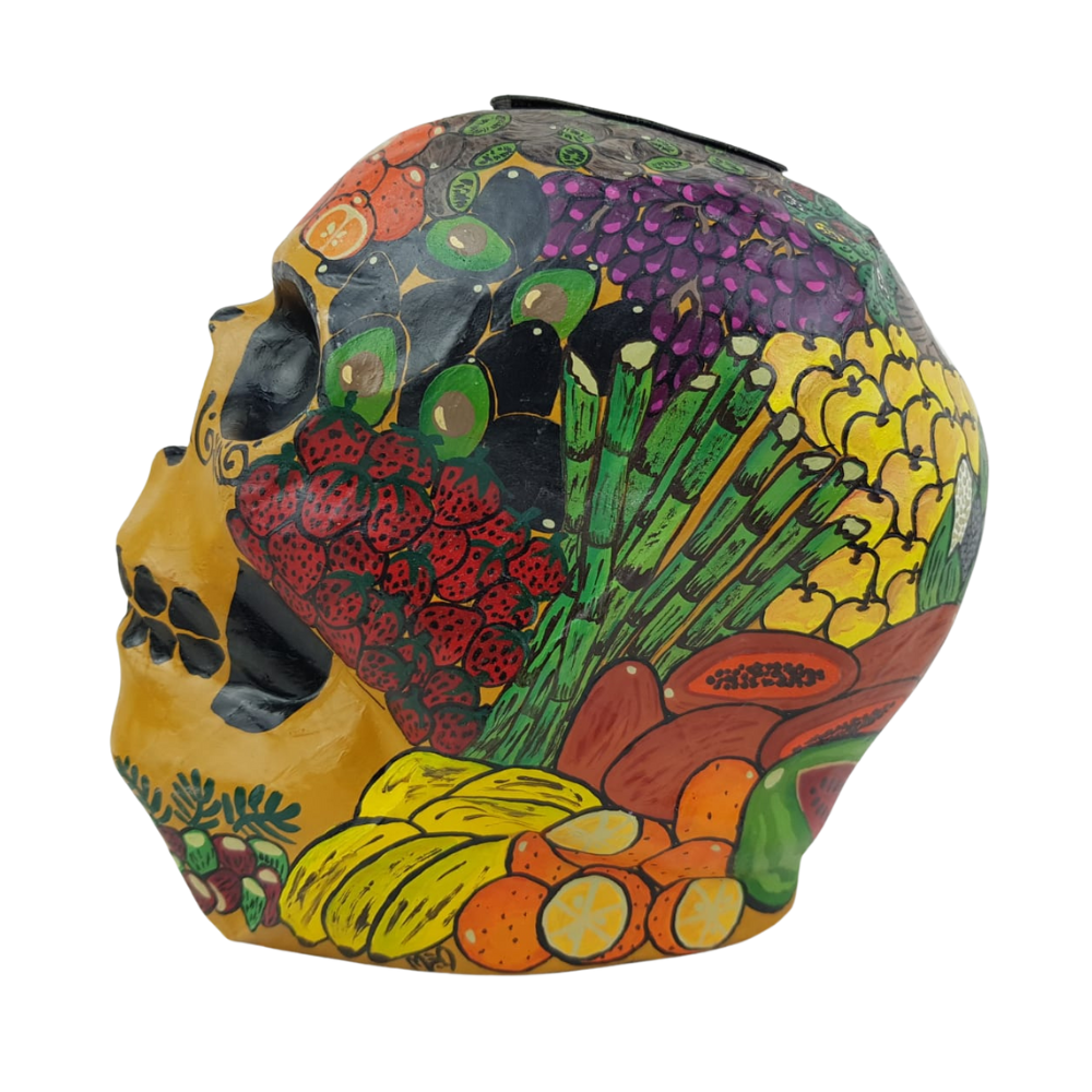 Alcancía con forma de cráneo elaborada con papel maché