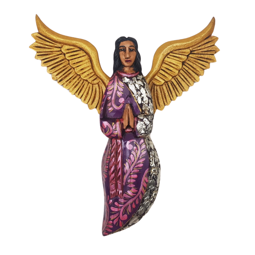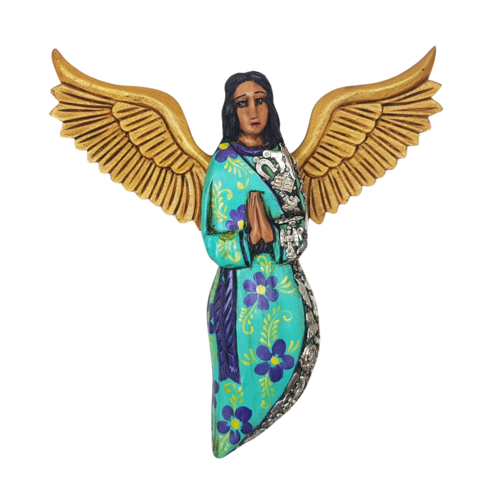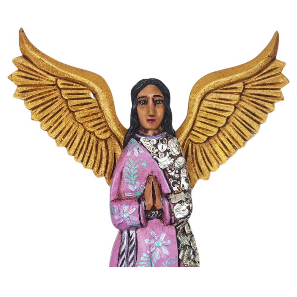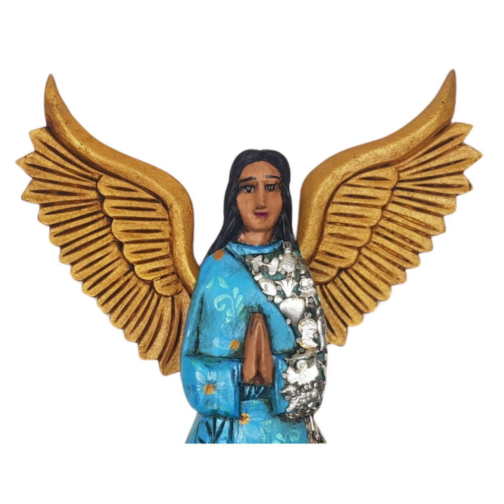 Hermoso angelito de madera copalillo decorado a mano con acabado mate y milagritos, trabajo del artesano Mario Mejía. La talla de madera es típica y representativa de Pátzcuaro Michoacán, lugar en donde esta artesanía fue creada.