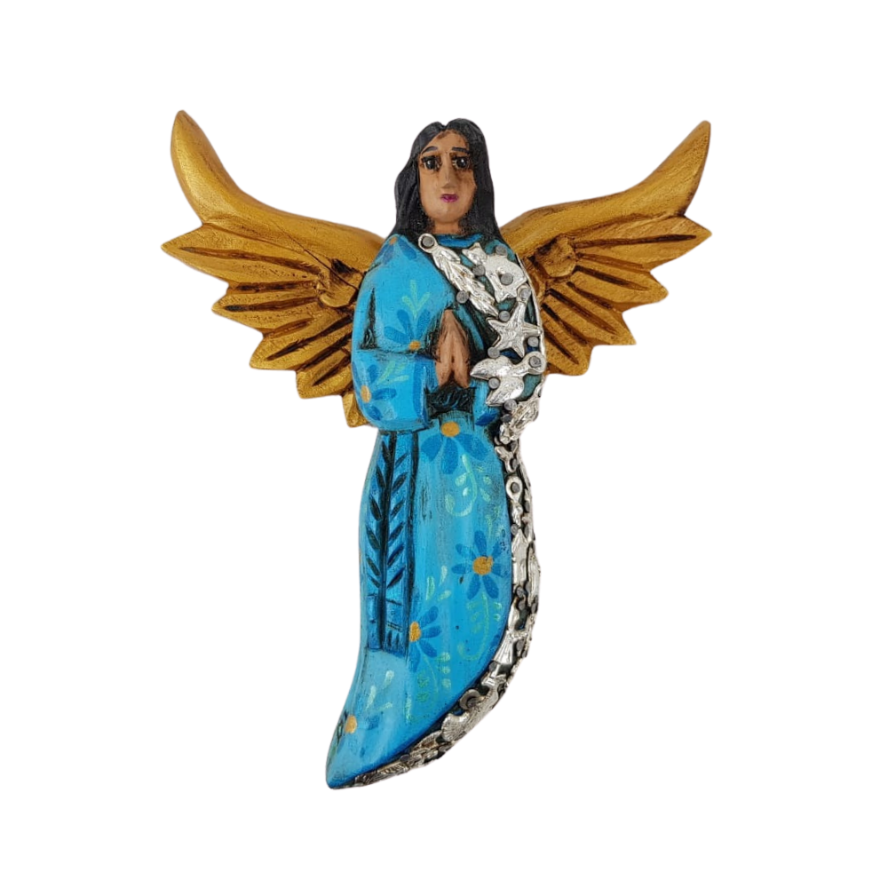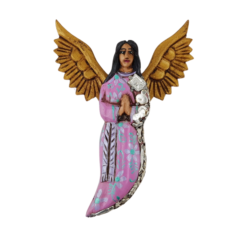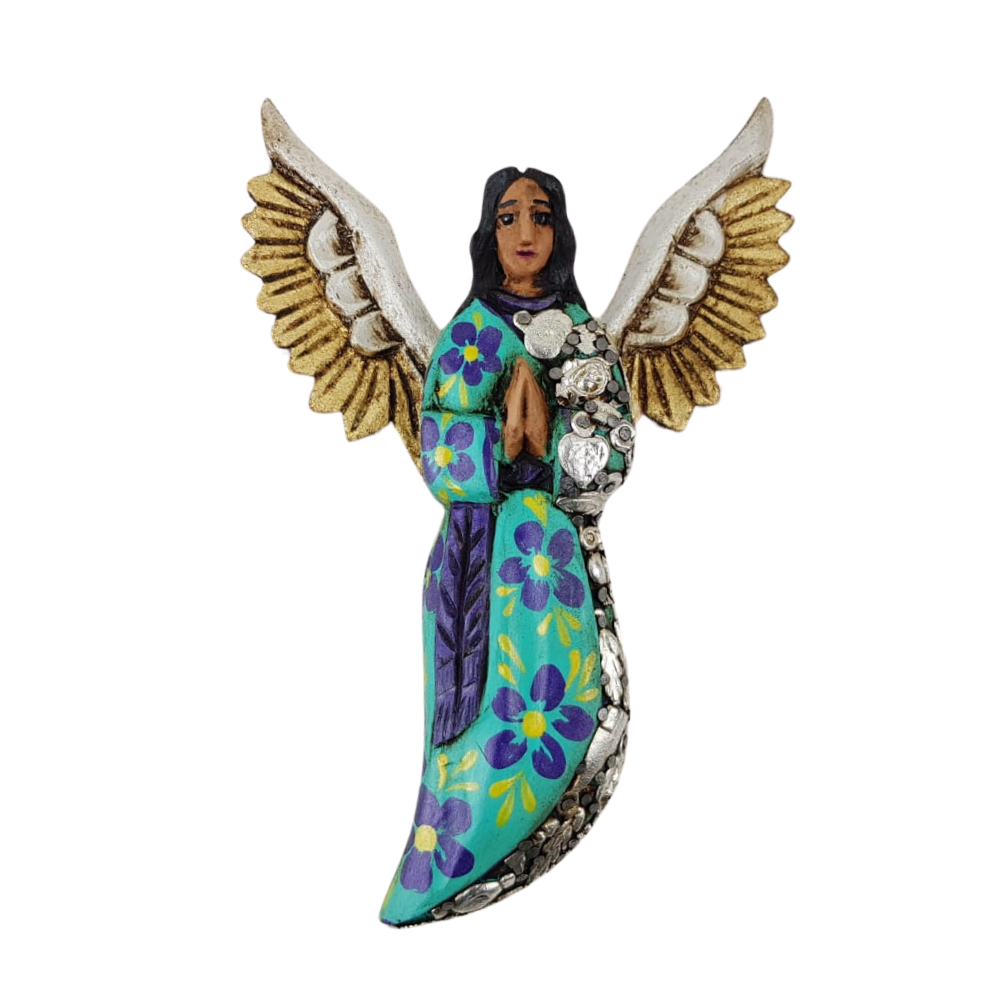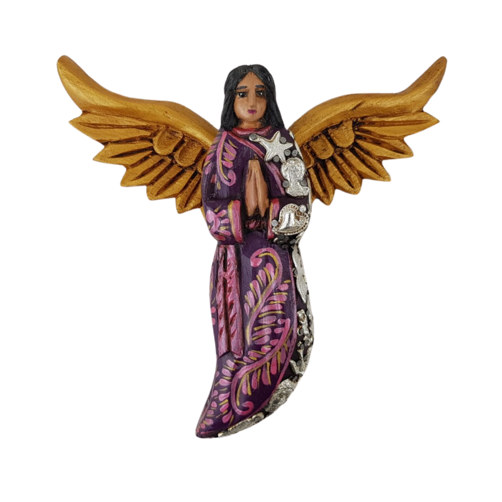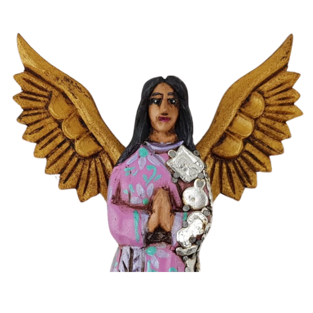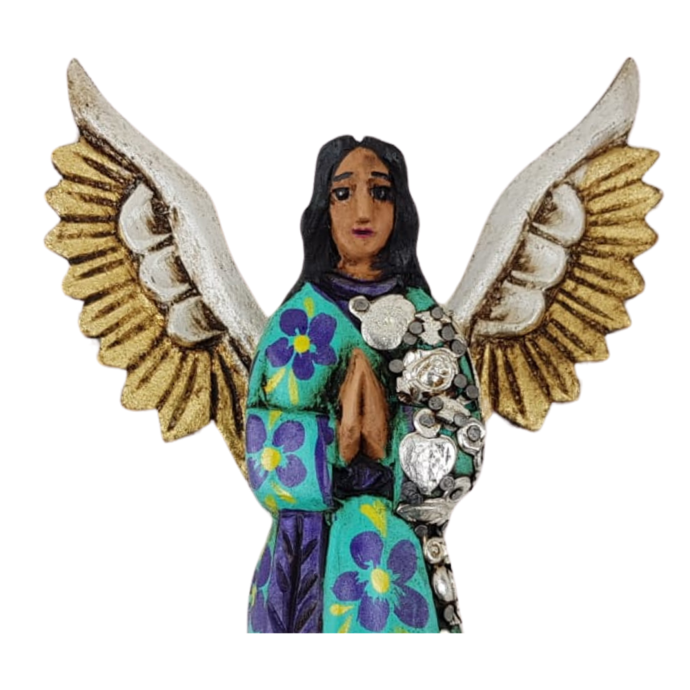 Hermoso angelito de madera copalillo decorado a mano con acabado mate y milagritos, trabajo del artesano Mario Mejía. La talla de madera es típica y representativa de Pátzcuaro Michoacán, lugar en donde esta artesanía fue creada.
