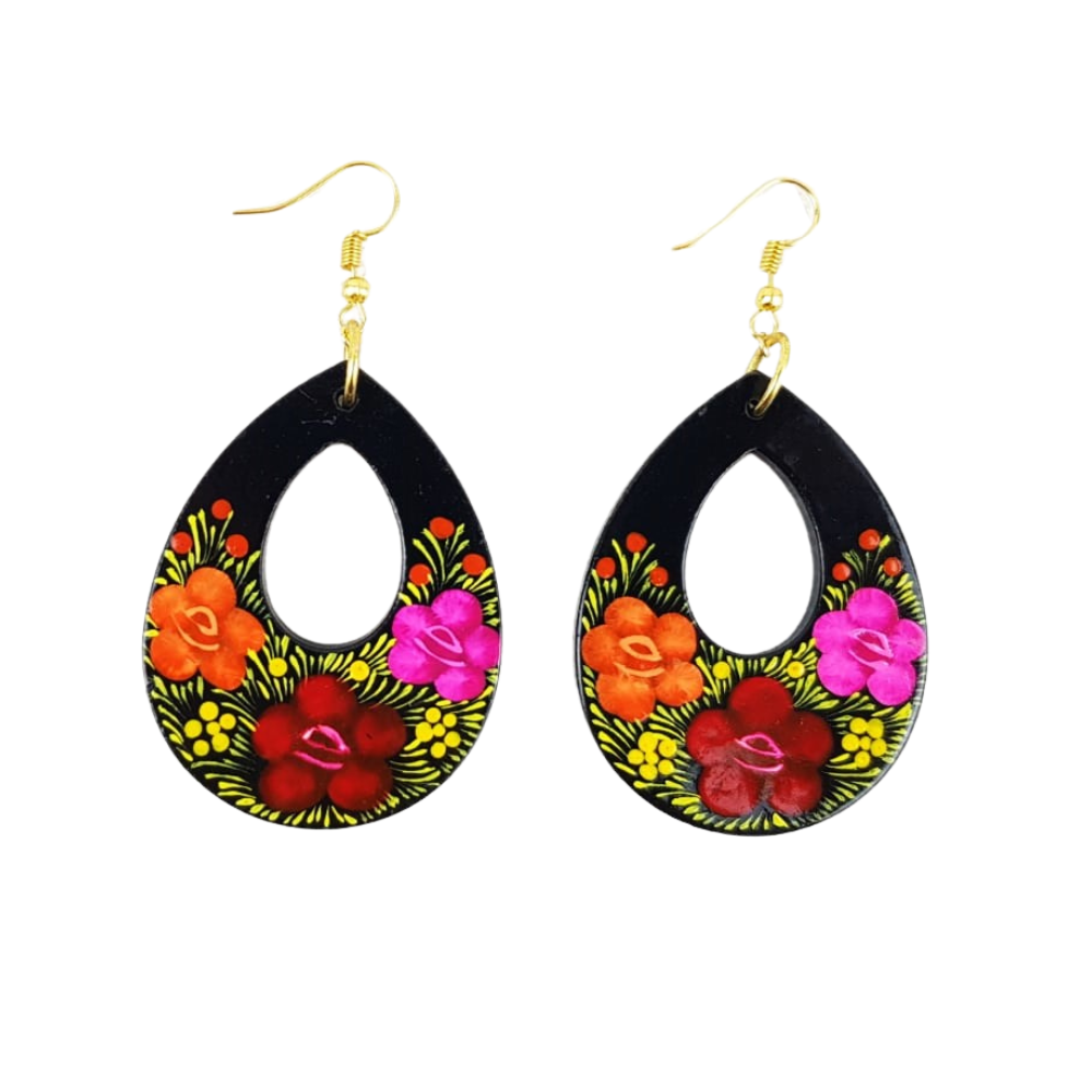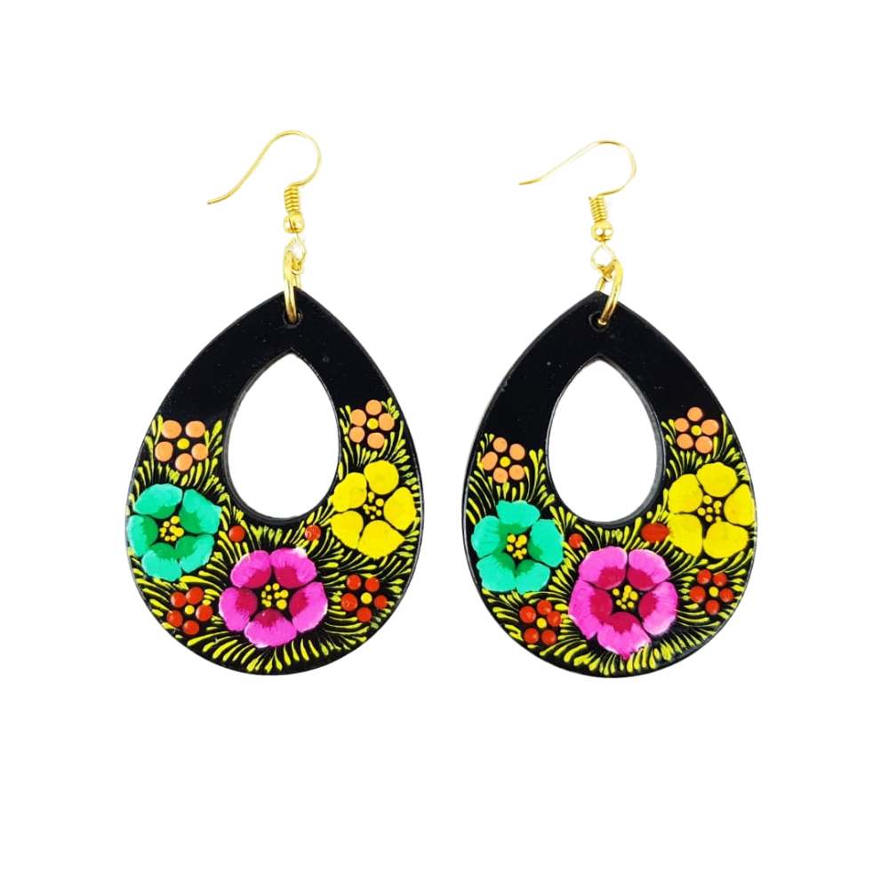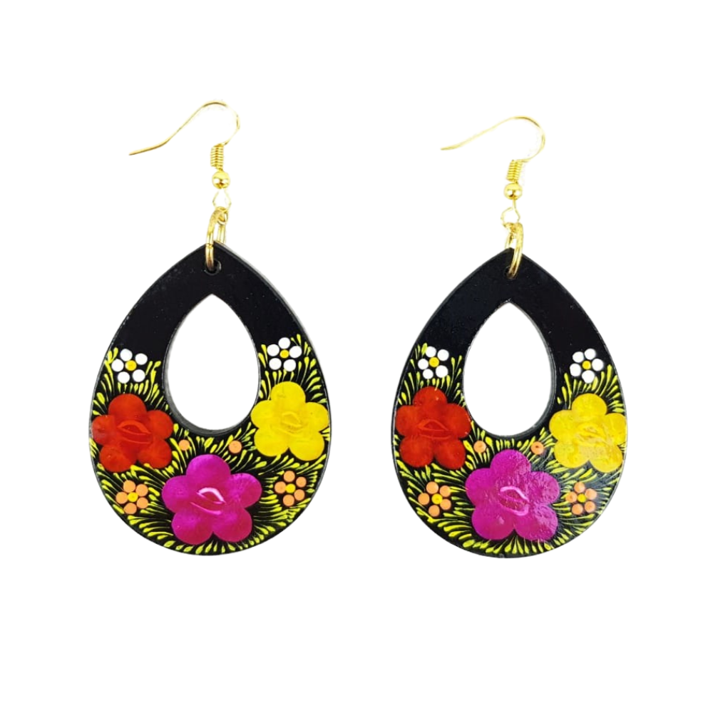 Estos bellos aretes de madera que son producto de una colaboración entre Jasiel Anahí López Ornelas de Guadalajara, Jalisco y, Mayvi Vázquez, de Chiapa de Corzo, Chiapas, quienes trabajan la madera y la pintan minuciosamente a mano.