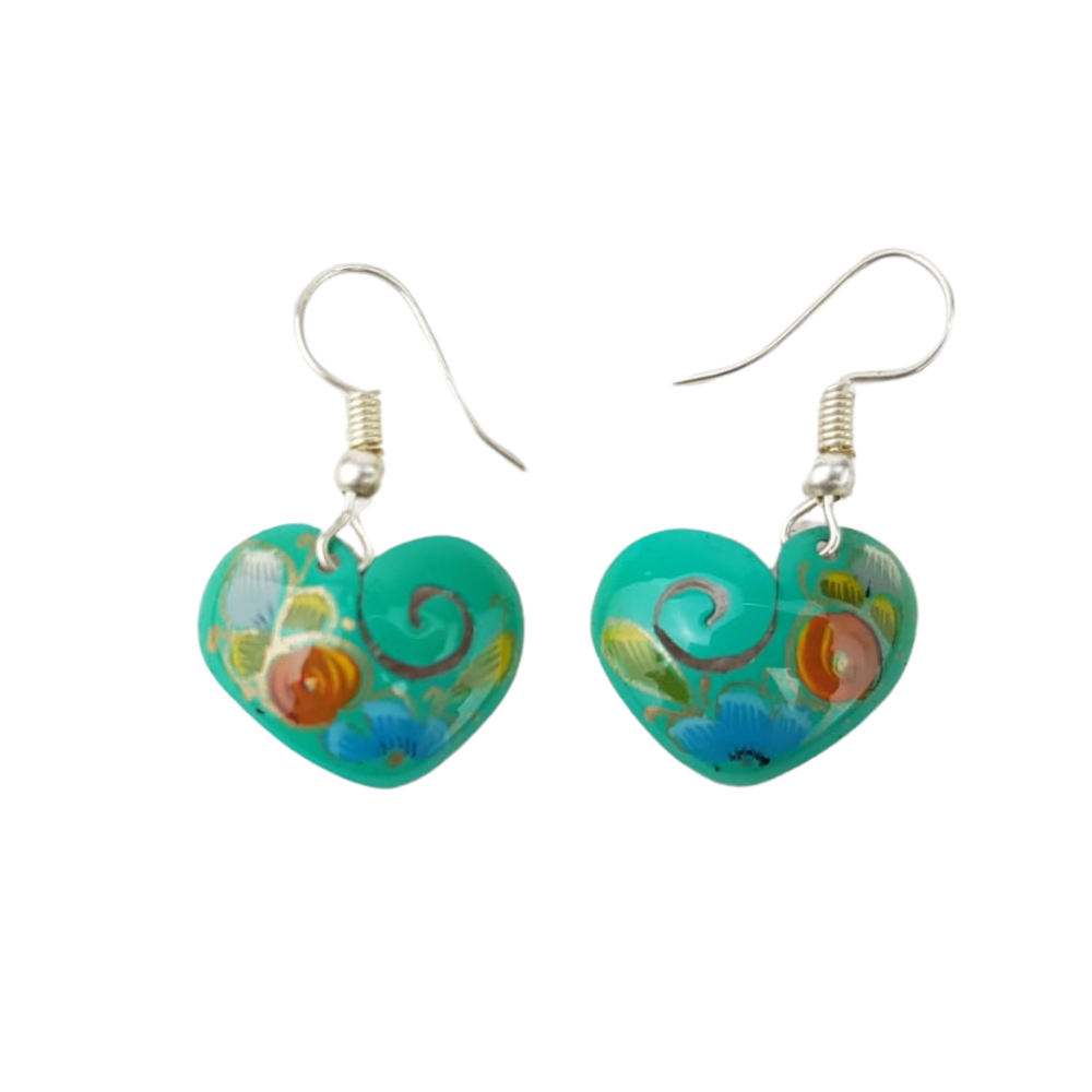 Arete hecho en cobre decorado con la técnica de laca perfilada con mariposas y flores, artesanía de Pátzcuaro, Michoacán elaborada por Víctor Gaona.
