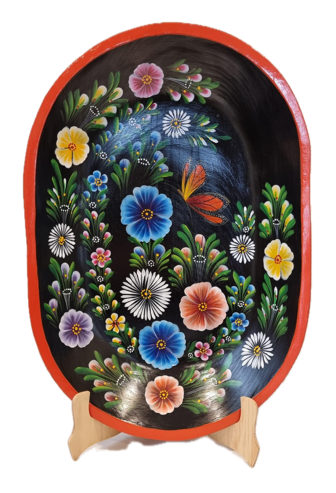 Hermosa batea de madera de pino con maque natural o negro. Esta artesanía mexicana es elaborada en Michoacán, por el maestro Joel Ramírez.