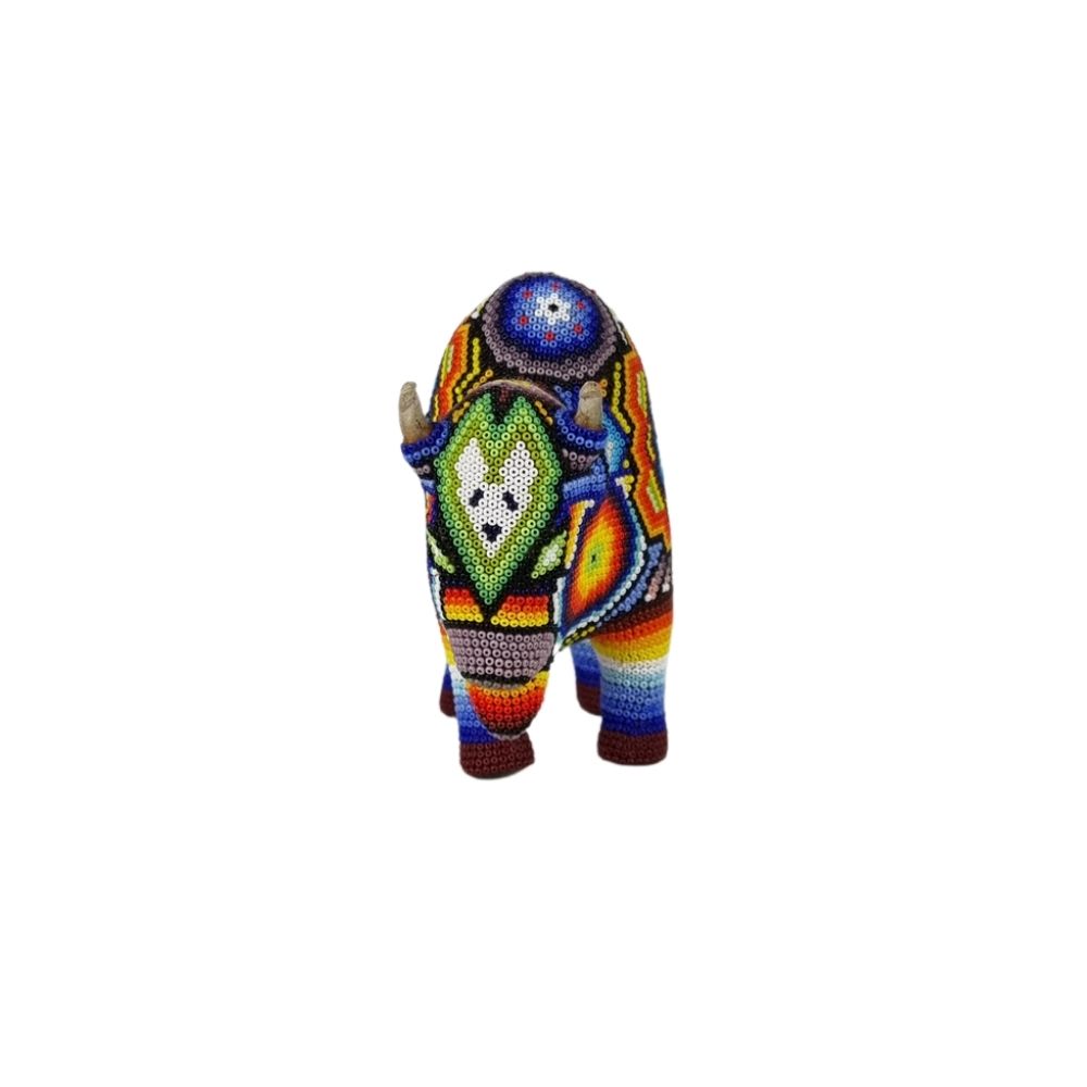 Increíble bisonte de tamaño mediano decorado con coloridos elementos de la cosmovisión Wixárika.