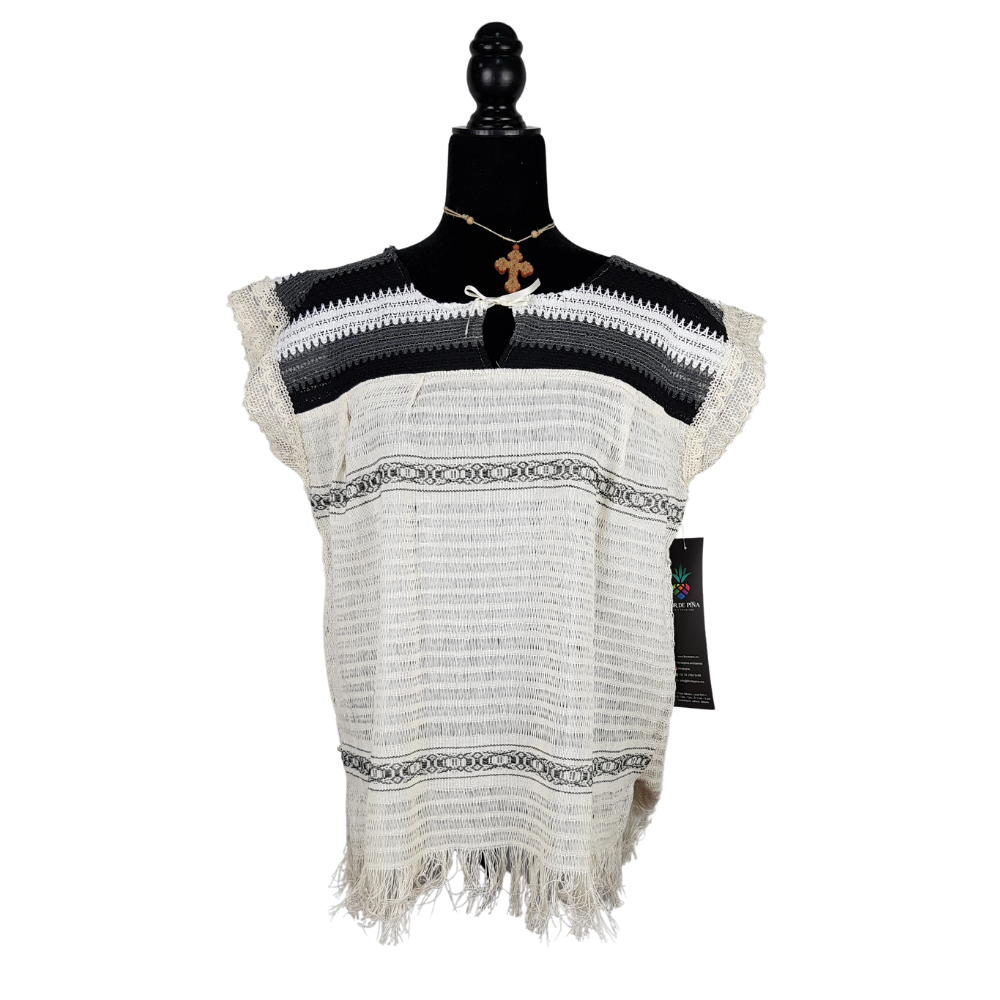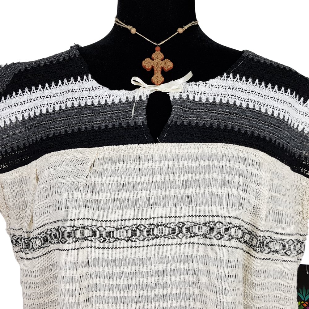 Blusa fresca de algodón, hecha a mano en Mitla Oaxaca, realizada por Itzel y su familia. Esta blusa es elaborada en telar de pedal y tiene textura calada, lo cual hace a esta prenda muy fresca.