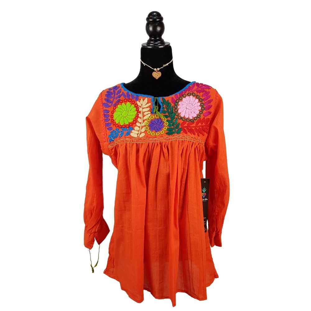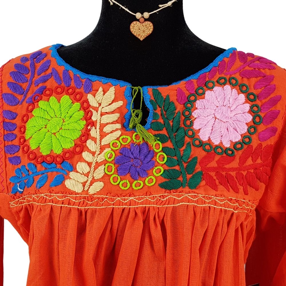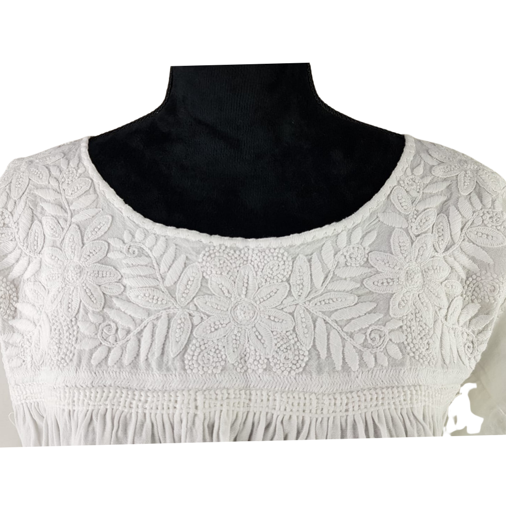 Blusón fresco de manta ligera, decorado al pecho con flores bordadas al estilo rococó.
