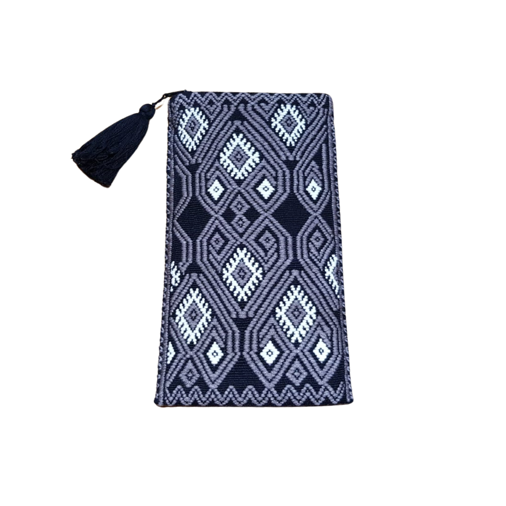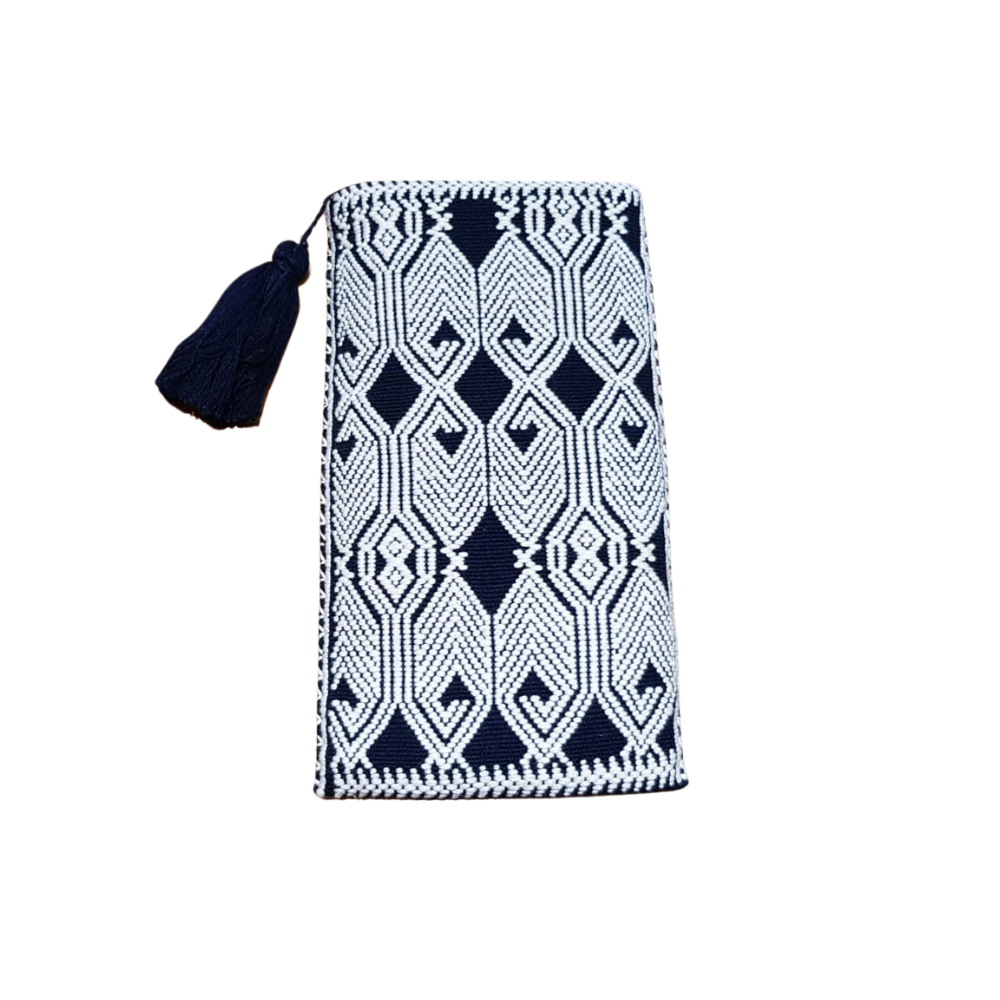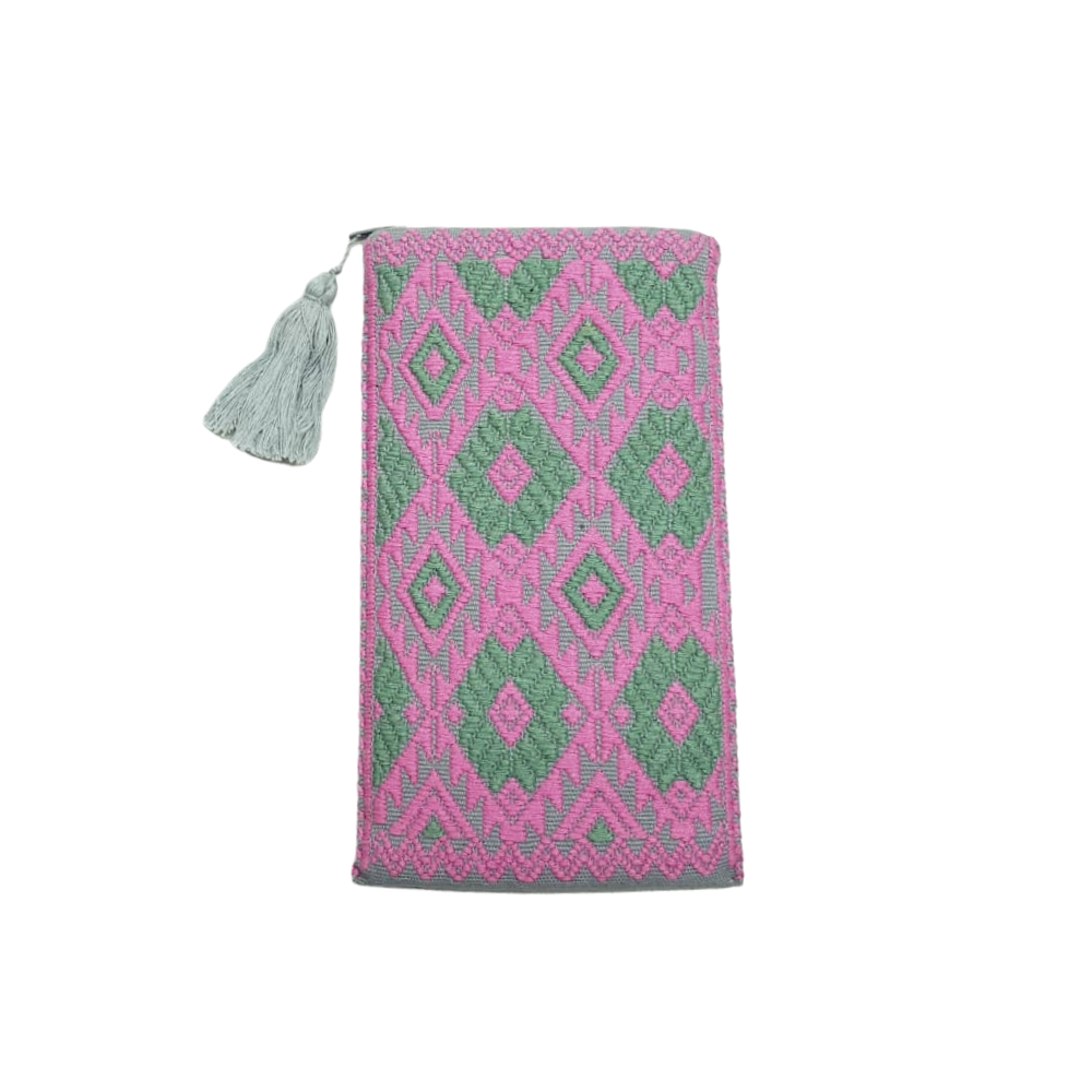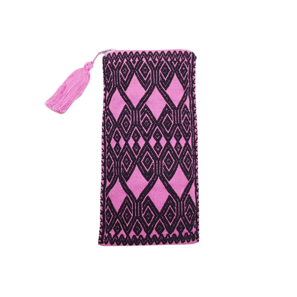 Bolsa porta lentes, con cierre, tejida con hilos de algodón en telar de cintura en San Andrés Larrainzar. Los textiles de Larrainzar son muy representativos de Chiapas, y se distinguen por sus formas geométricas.