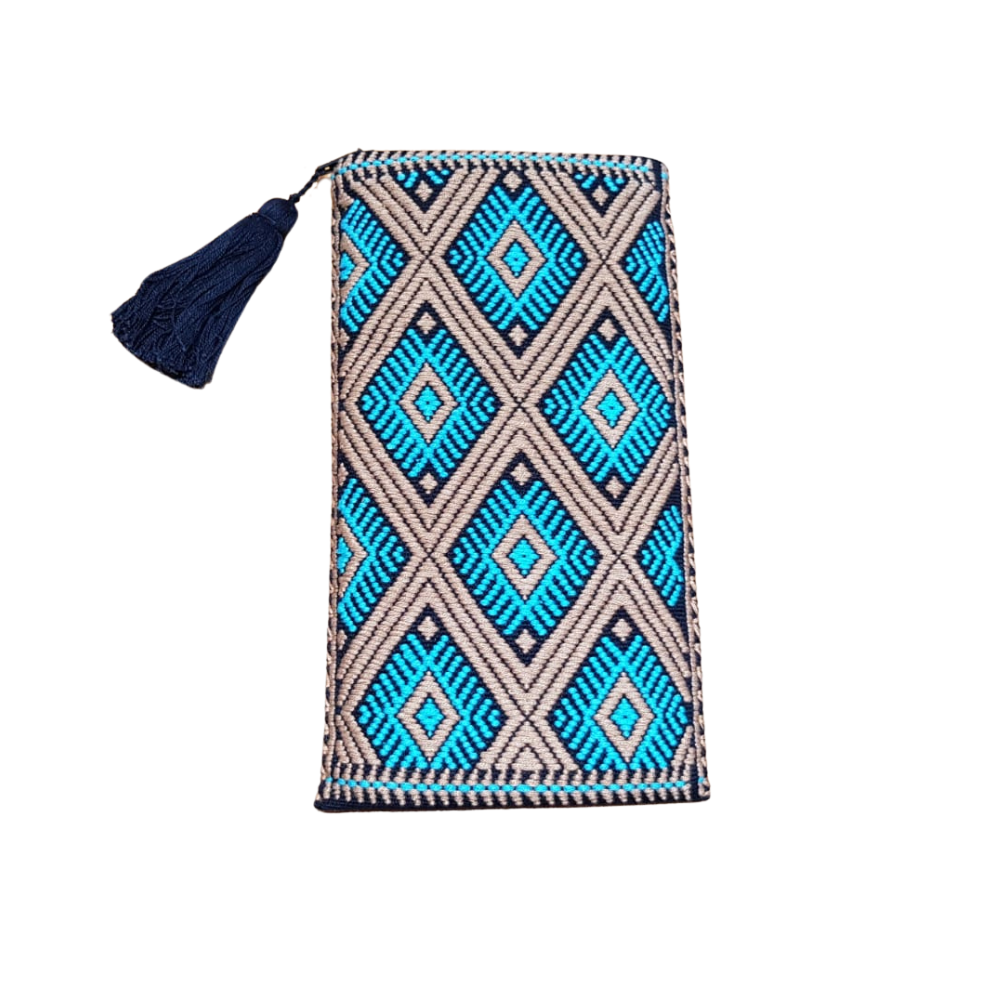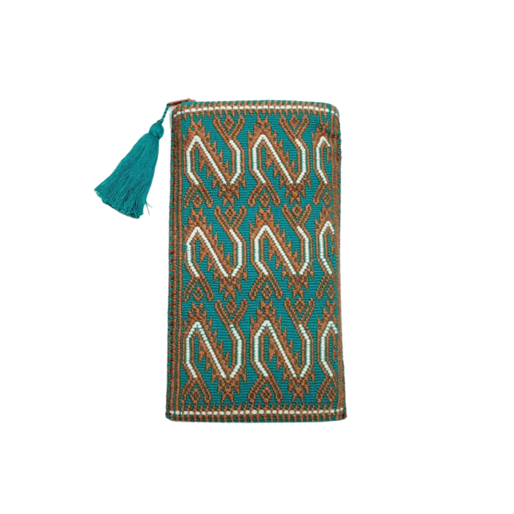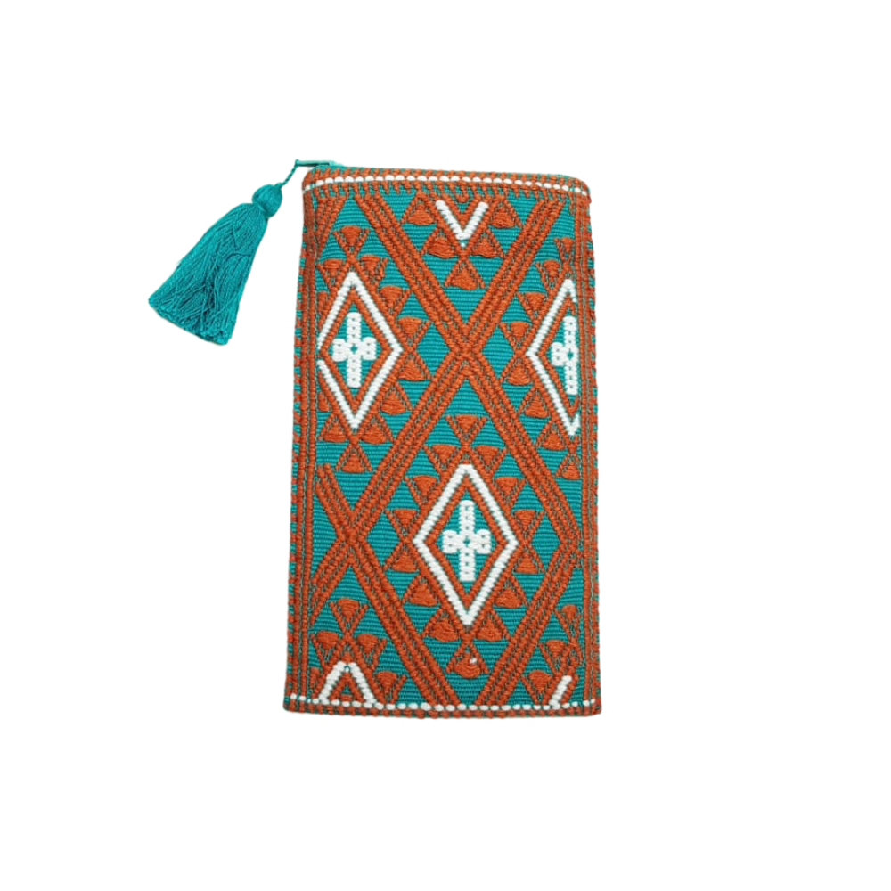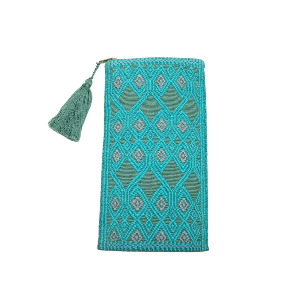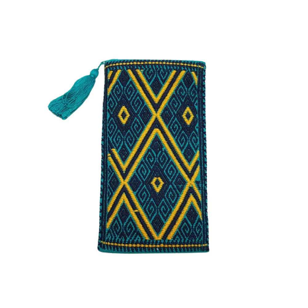 Bolsa porta lentes, con cierre, tejida con hilos de algodón en telar de cintura en San Andrés Larrainzar. Los textiles de Larrainzar son muy representativos de Chiapas, y se distinguen por sus formas geométricas.