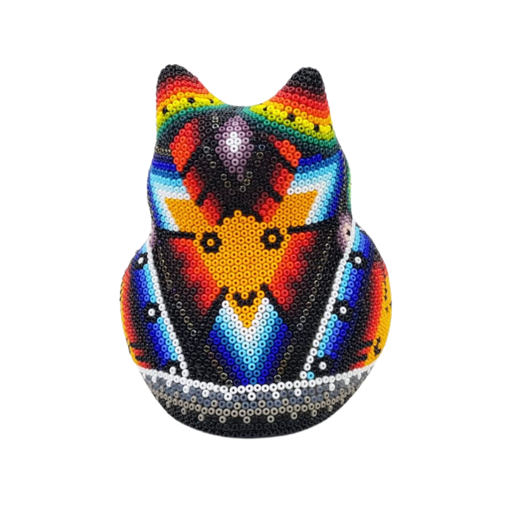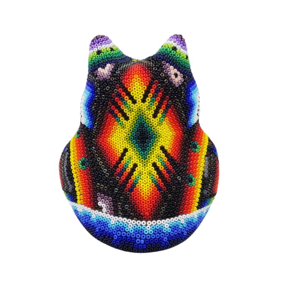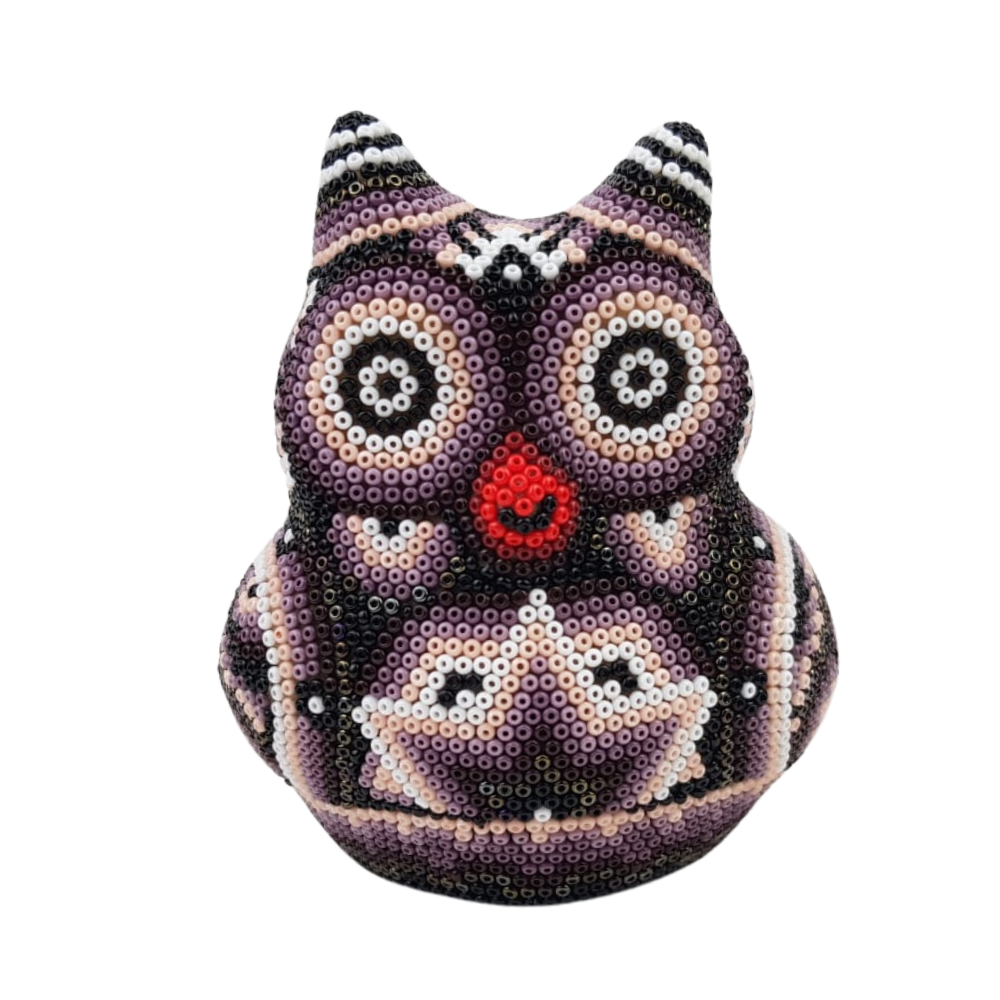 Increíble búho de papel maché, decorado con coloridos elementos de la cosmovisión Wixárika.