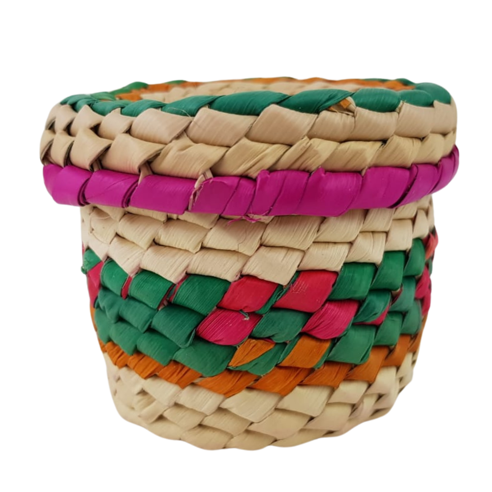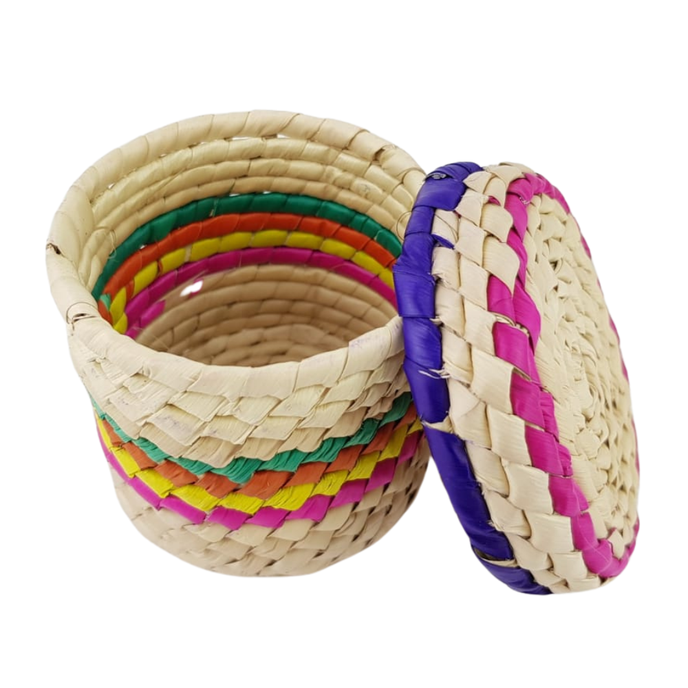 Caja de cilíndrica de palma, de colores