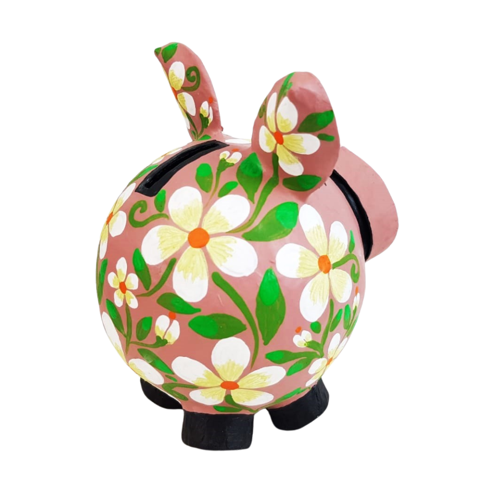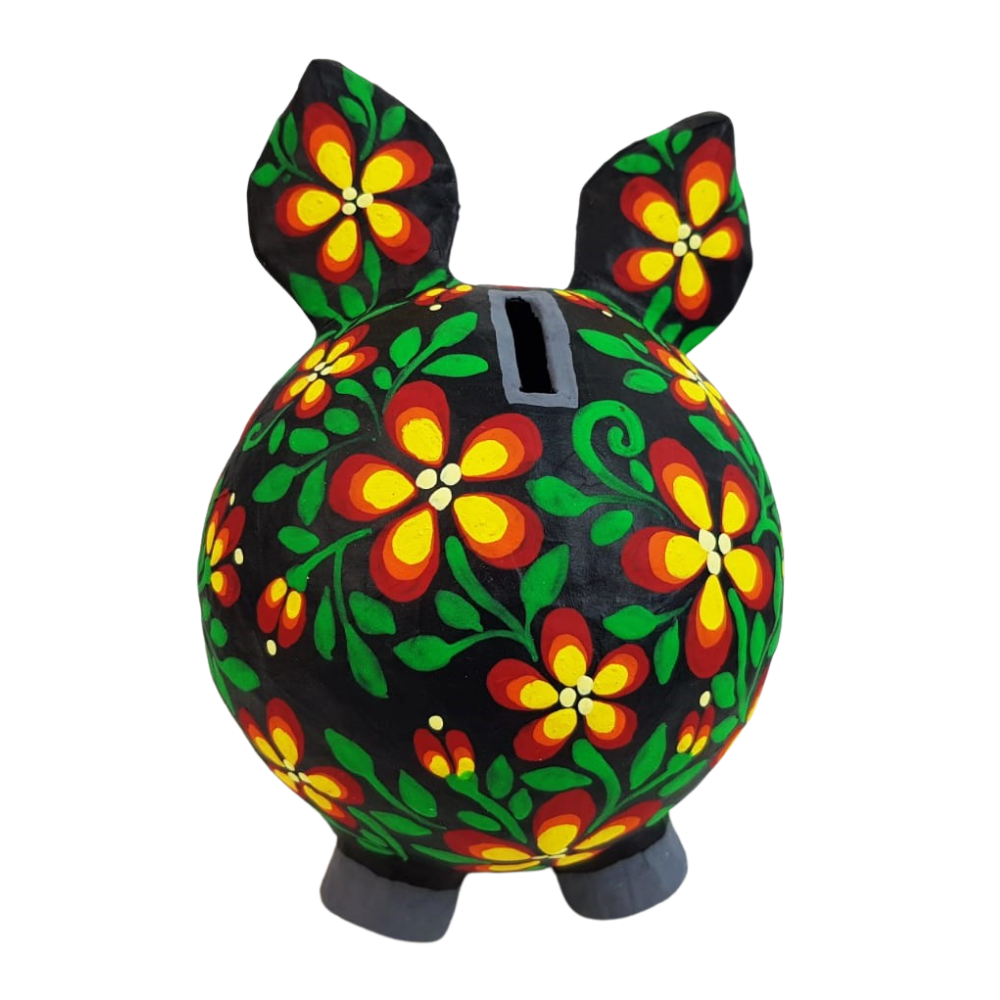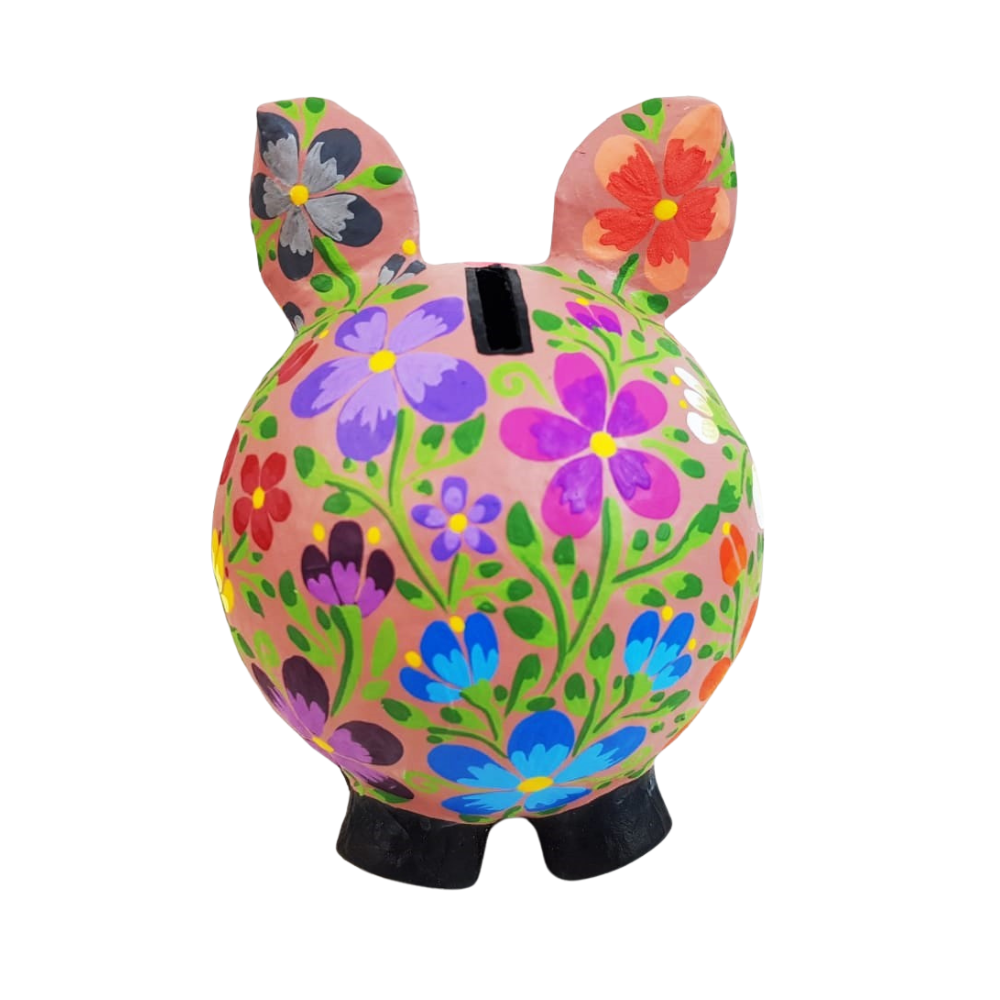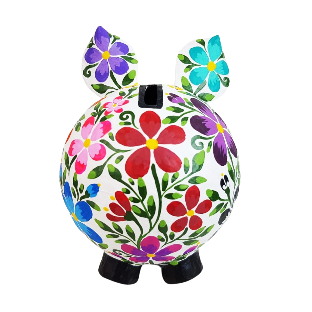 Alcancía elaborada en papel maché, hecha y pintada a mano por Mely Aguayo en Guadalajara, Jalisco. Una artesanía ideal para decorar tus espacios y reforzar la cultura del ahorro. Un detalle importante es que la trompita del cerdito se desmonta para acceder a tus ahorros y no tengas que destruir la pieza.