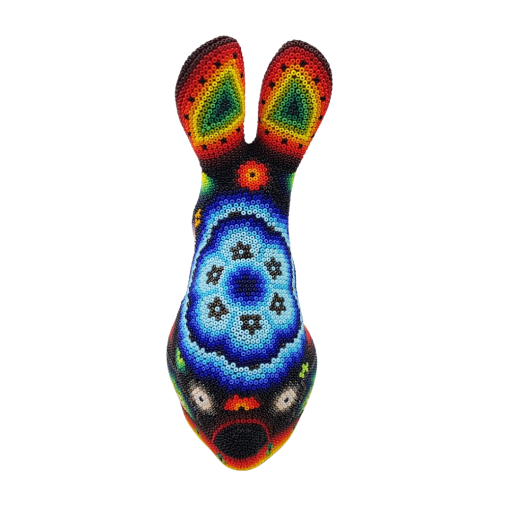 Increíble conejo sentado de papel maché, decorado con coloridos elementos de la cosmovisión Wixárika.