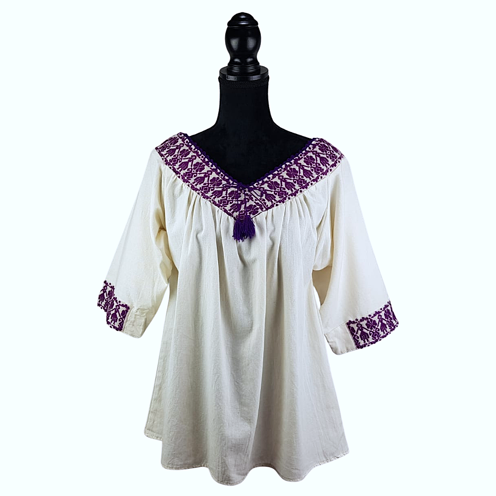 Blusa Atla de manta con manga 3/4 y pechera con bordado de hilván de Puebla