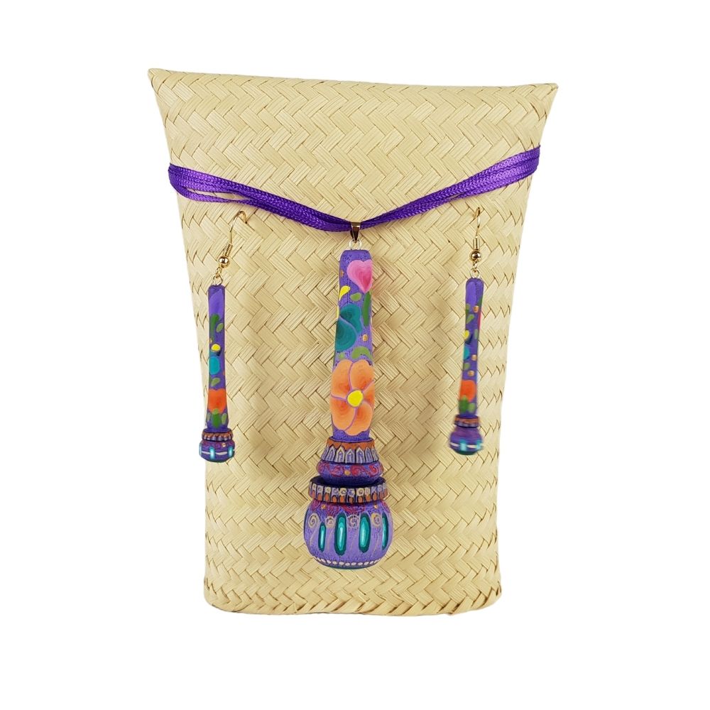 Hermoso juego de joyería tradicional, dije y aretes con forma de molinillo hechos a mano por artesanos oaxaqueños de San Martín Tilcajete. Para su elaboración se cortó la madera de copal, se talló a mano y se selló para hacer duradera la pieza. Esta artesanía tallada en madera fue decorada con gran detalle en el taller de la familia Jiménez.