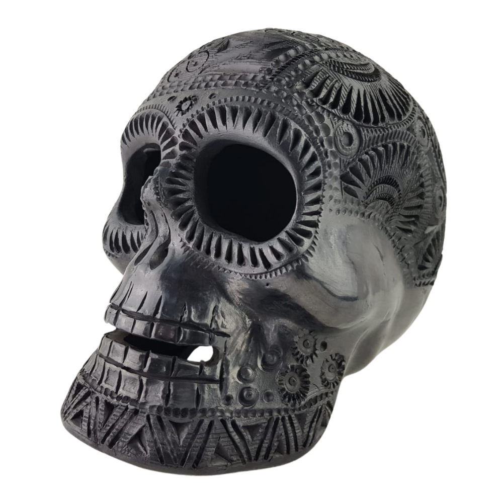 Cráneo grande elaborado con barro negro, en Oaxaca