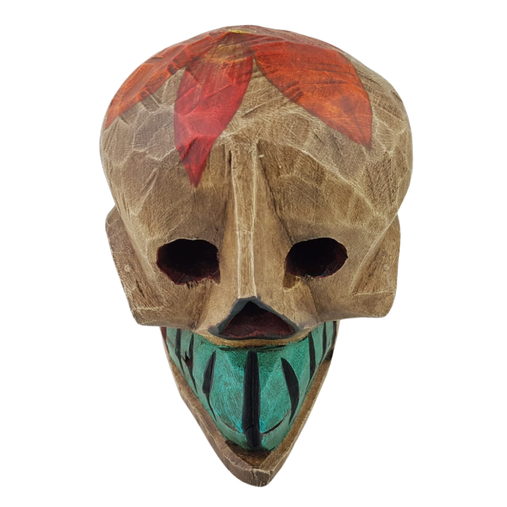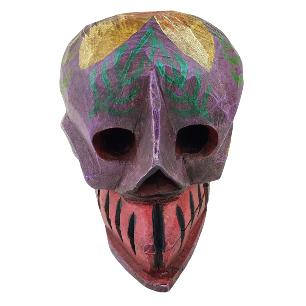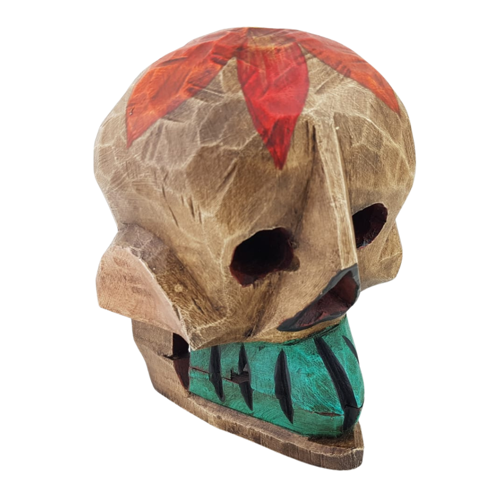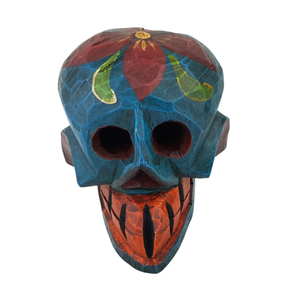 Este cráneo de origen purépecha, está hecho de madera de pino tallada a mano con trazos un tanto toscos que le dan una aspecto rústico muy original. La mandíbula tiene movilidad, lo cual le da a la pieza un toque divertido. Los colores son fuertes y alegres, con decoración de flores, lo que nos puede recordar la frescura de la vida, contrastando con lo que representa el cráneo.