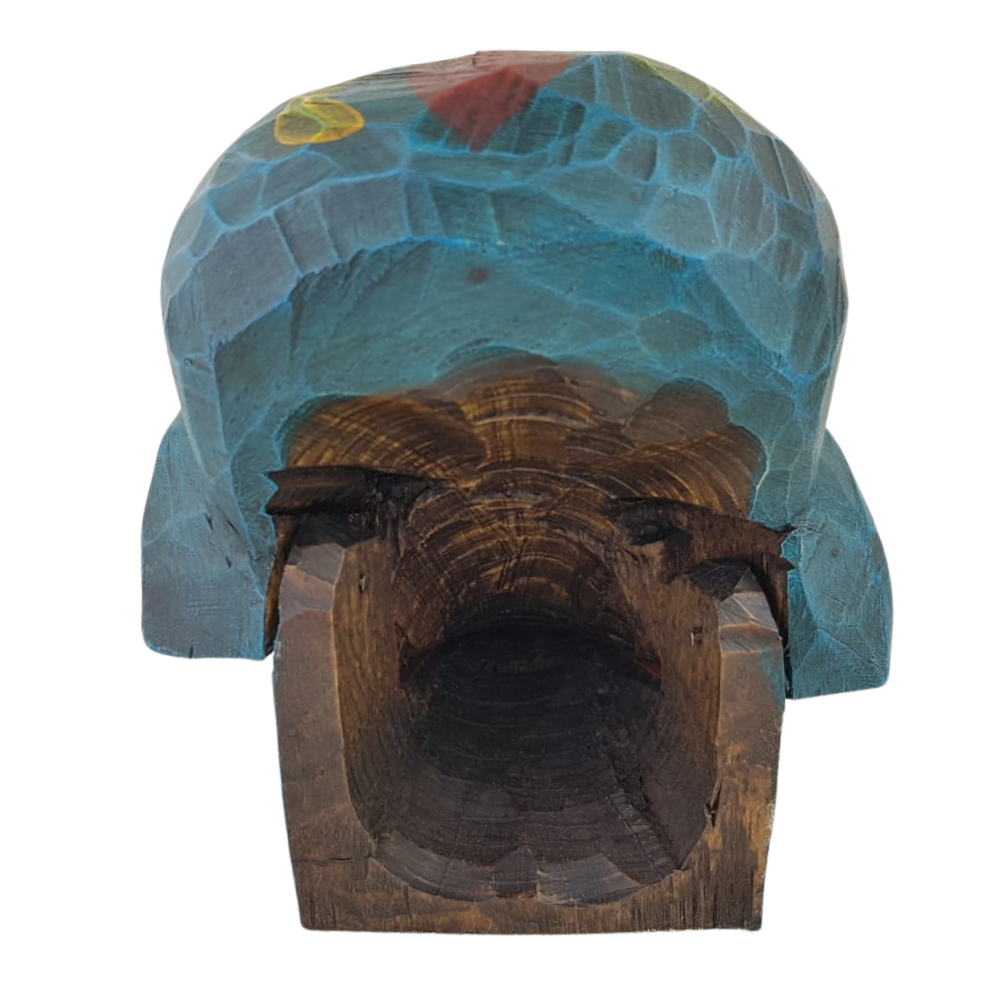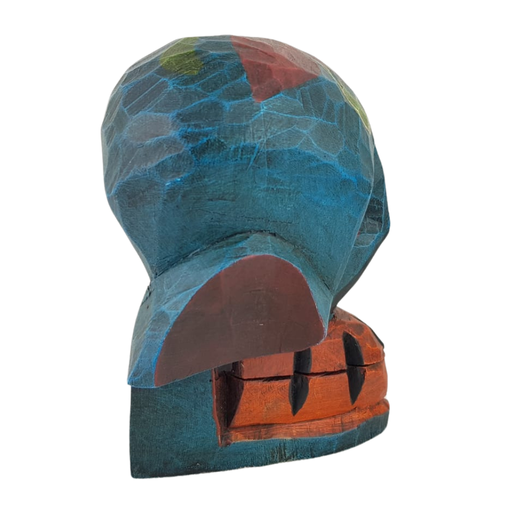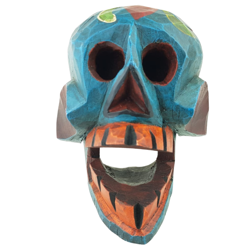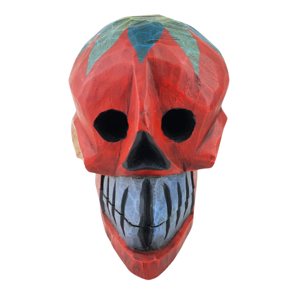 Este cráneo de origen purépecha, está hecho de madera de pino tallada a mano con trazos un tanto toscos que le dan una aspecto rústico muy original. La mandíbula tiene movilidad, lo cual le da a la pieza un toque divertido. Los colores son fuertes y alegres, con decoración de flores, lo que nos puede recordar la frescura de la vida, contrastando con lo que representa el cráneo.