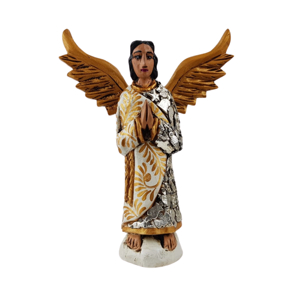 Hermoso angelito de madera copalillo decorado a mano con acabado mate y milagritos, trabajo del artesano Mario Mejía. La talla de madera es típica y representativa de Pátzcuaro Michoacán, lugar en donde esta artesanía fue creada.