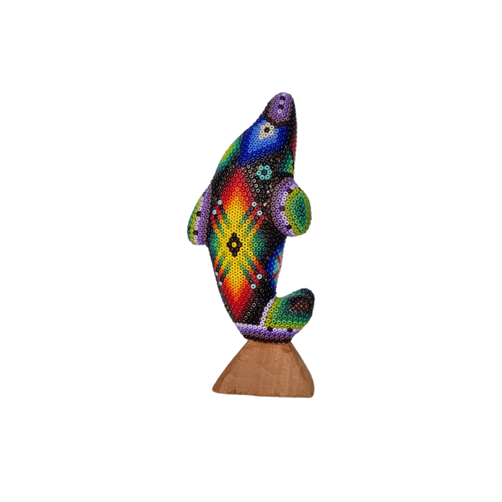 Increíble delfín decorado con coloridos elementos de la cosmovisión Wixárica.