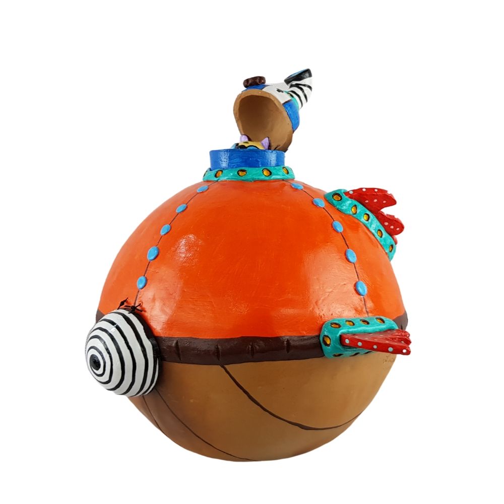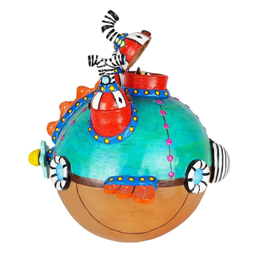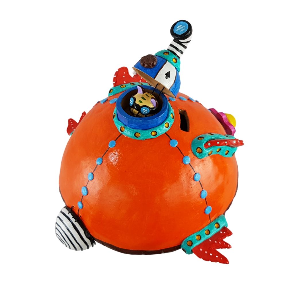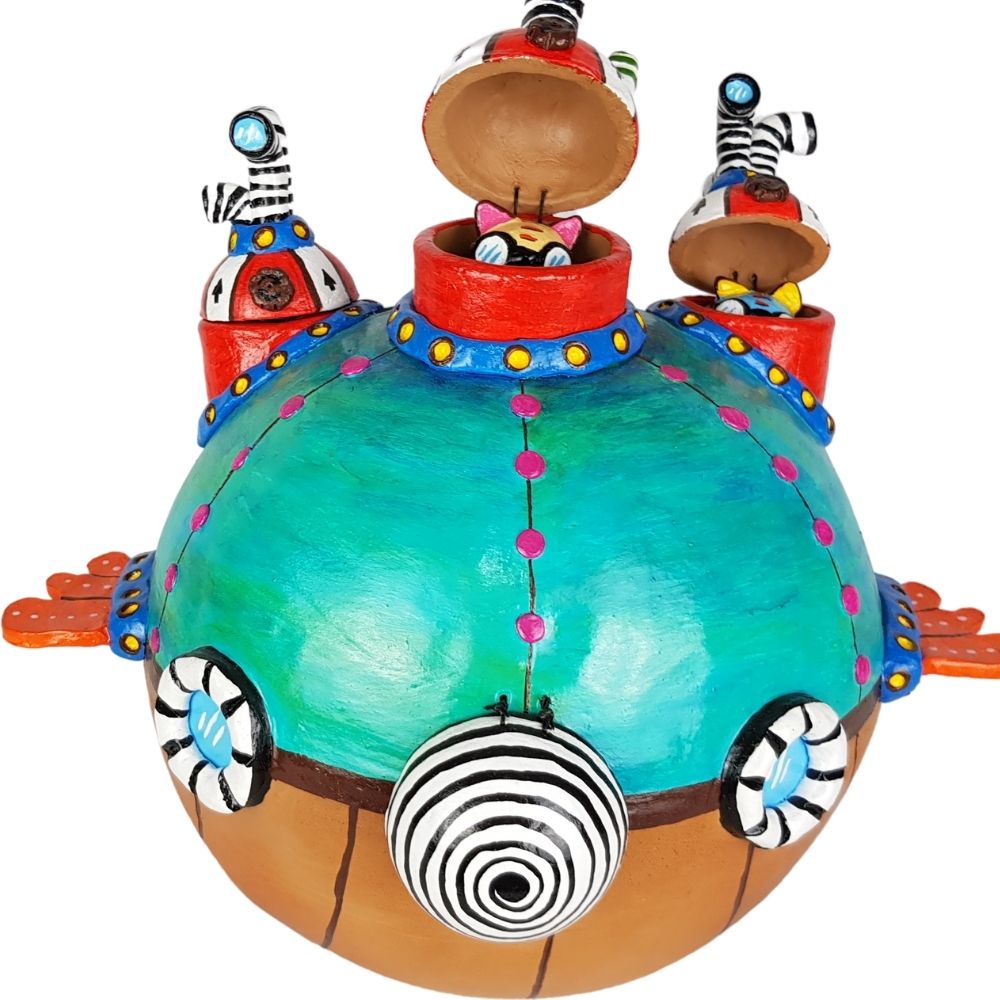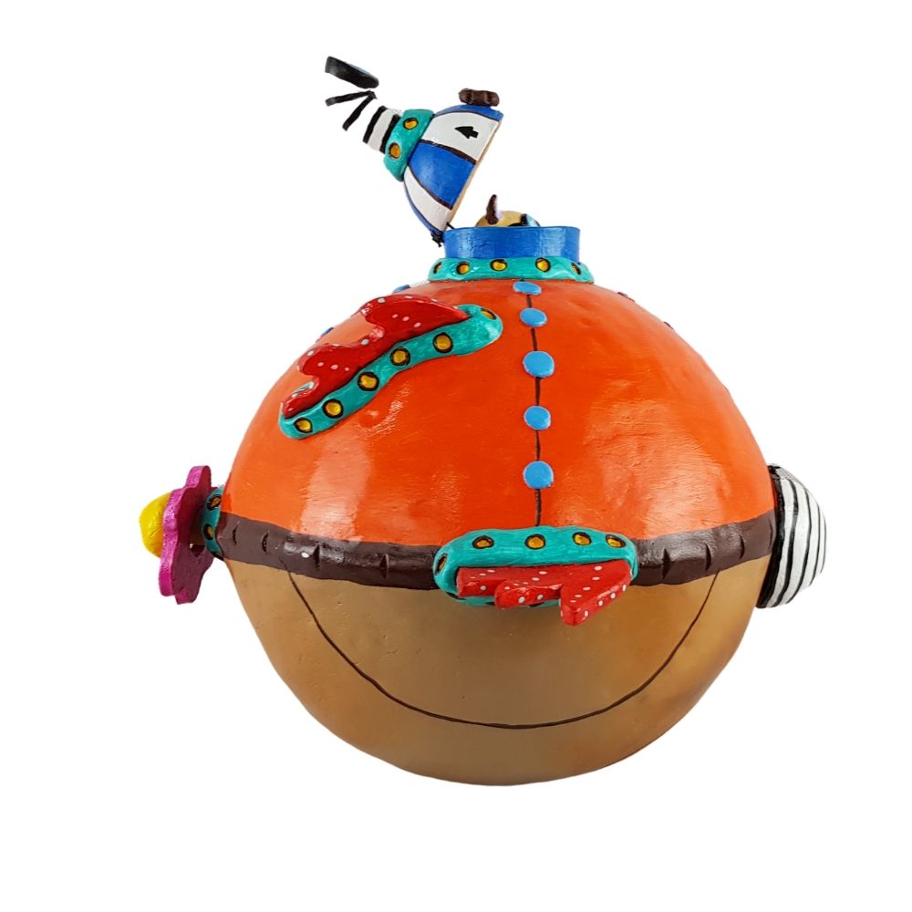 Alcancía en forma de submarino bola, esta increíble artesanía fue elaborada con molde e intervenida para darle la forma deseada, agregando una trampa al frente que permite sacar el dinero sin tener que romper la pieza, piezas movibles y atractivos nahuales que hacen de este trabajo mexicano algo único.