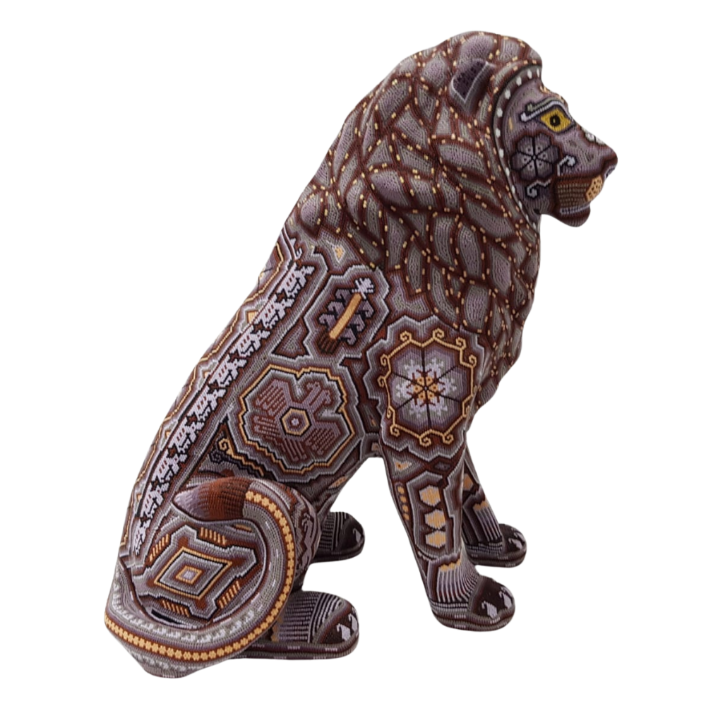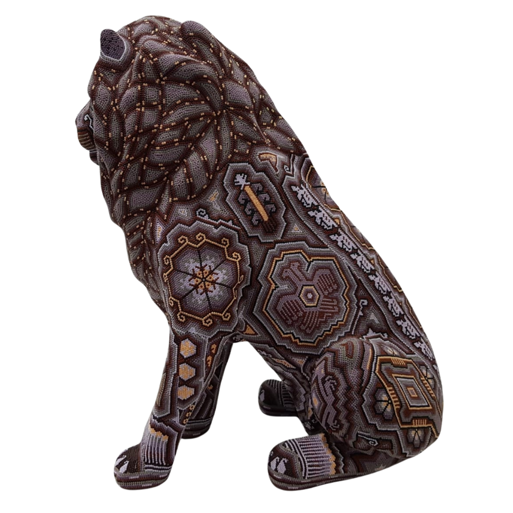 Increíble león decorado con elementos de la cosmovisión Wixárika .