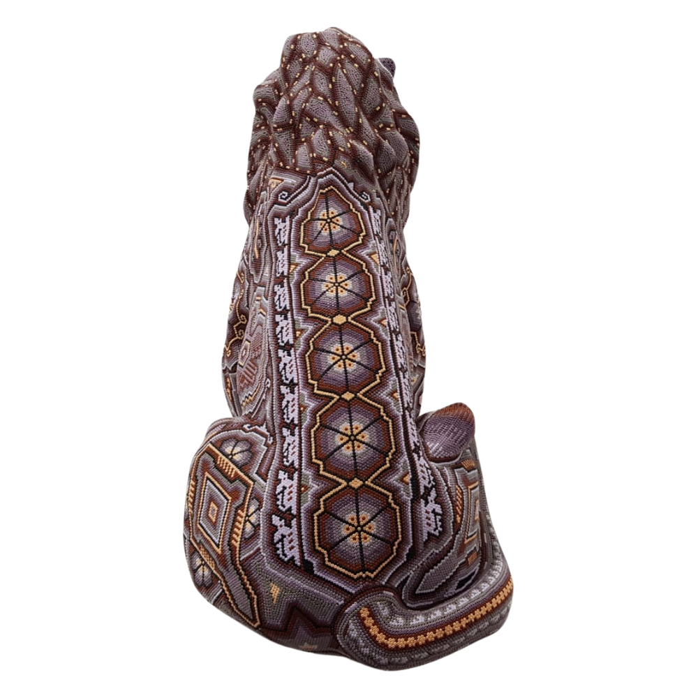 León grande sentado, decorado con motivos wixárika