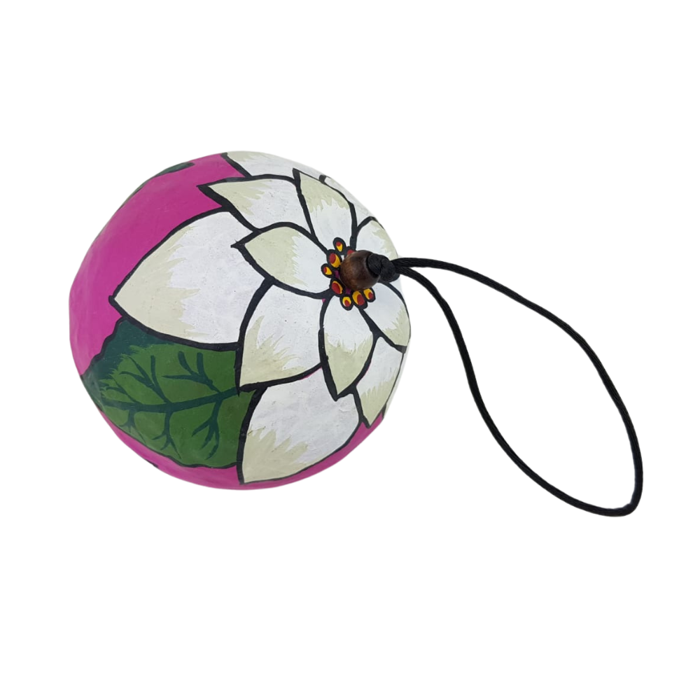 Esfera elaborada en papel maché, hecha y pintada a mano por Mely Aguayo en Guadalajara, Jalisco. Una artesanía ideal para decorar tu árbol de navidad o tus espacios, y darles un toque muy mexicano y pintoresco.