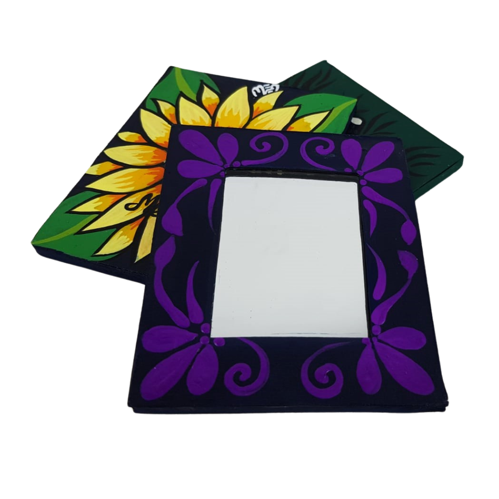 Espejo hecho de papel maché elaborado y pintado a mano, por la artesana Mely Aguayo en Guadalajara, Jalisco. Una artesanía ideal para tenerlo en tu bolso, en el cajón de tu escritorio, y para un obsequio muy mexicano y pintoresco.