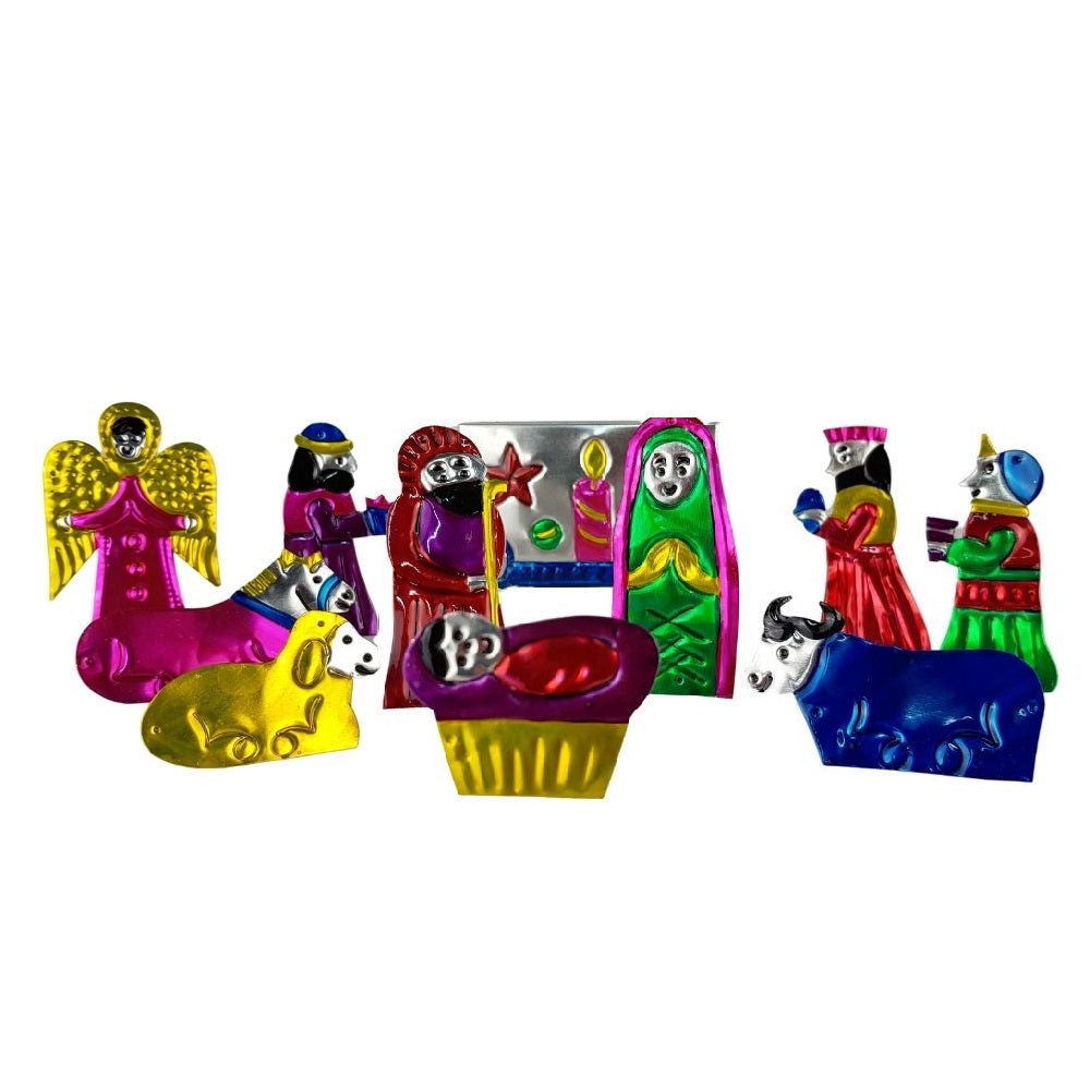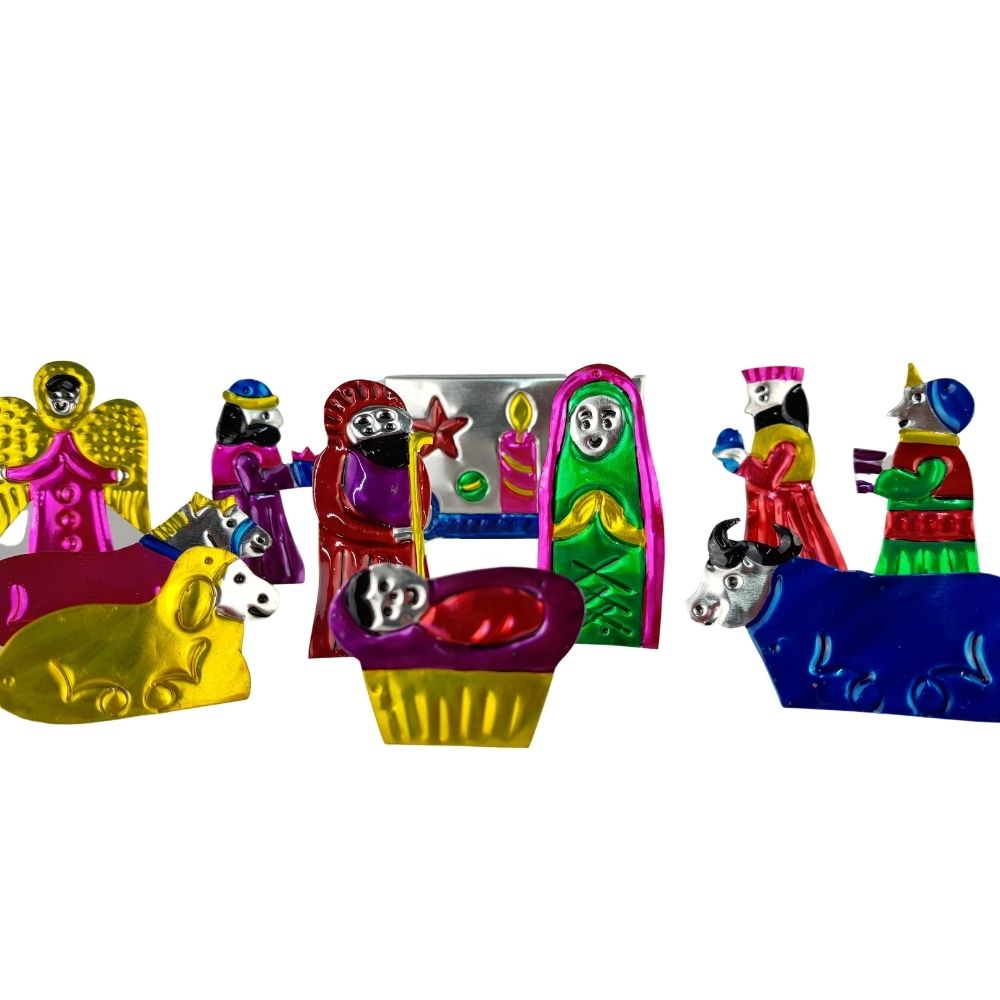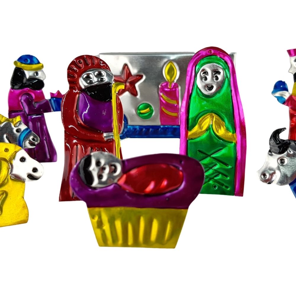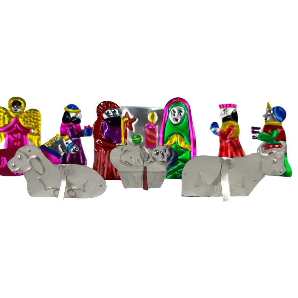 El nacimiento incluye: José, María, el niño dios, los tres reyes magos, un angelito, un borreguito, un toro, una mulita y una caja de hojalata.