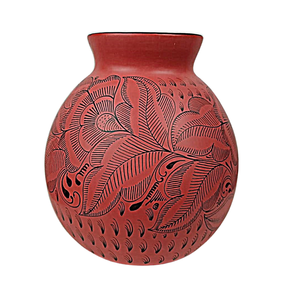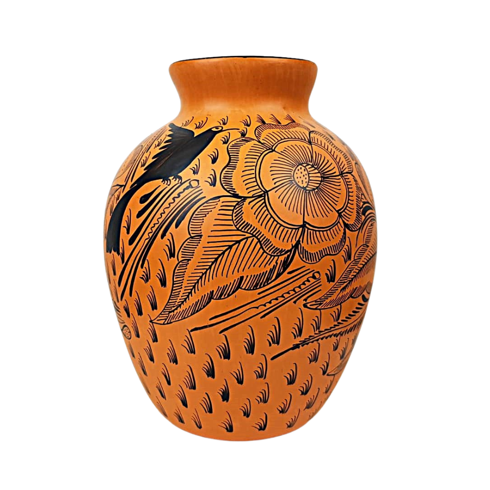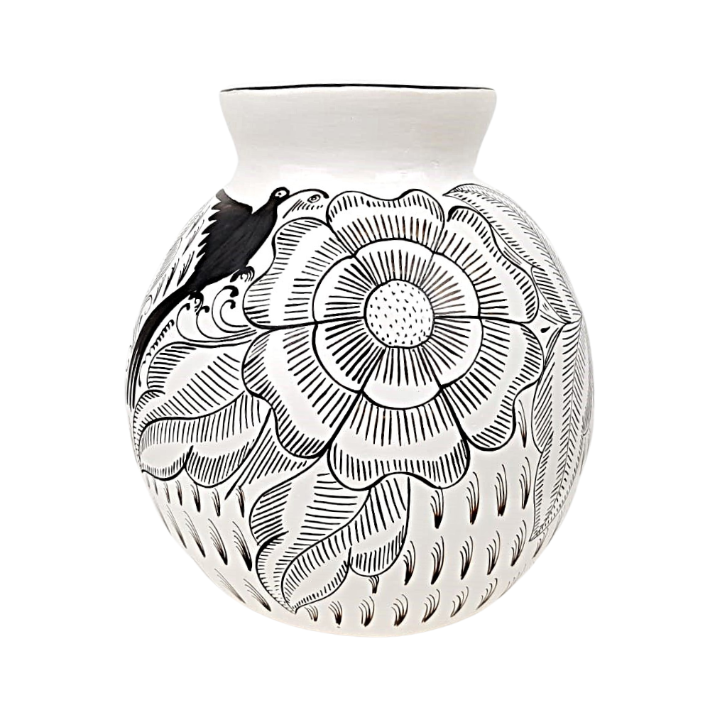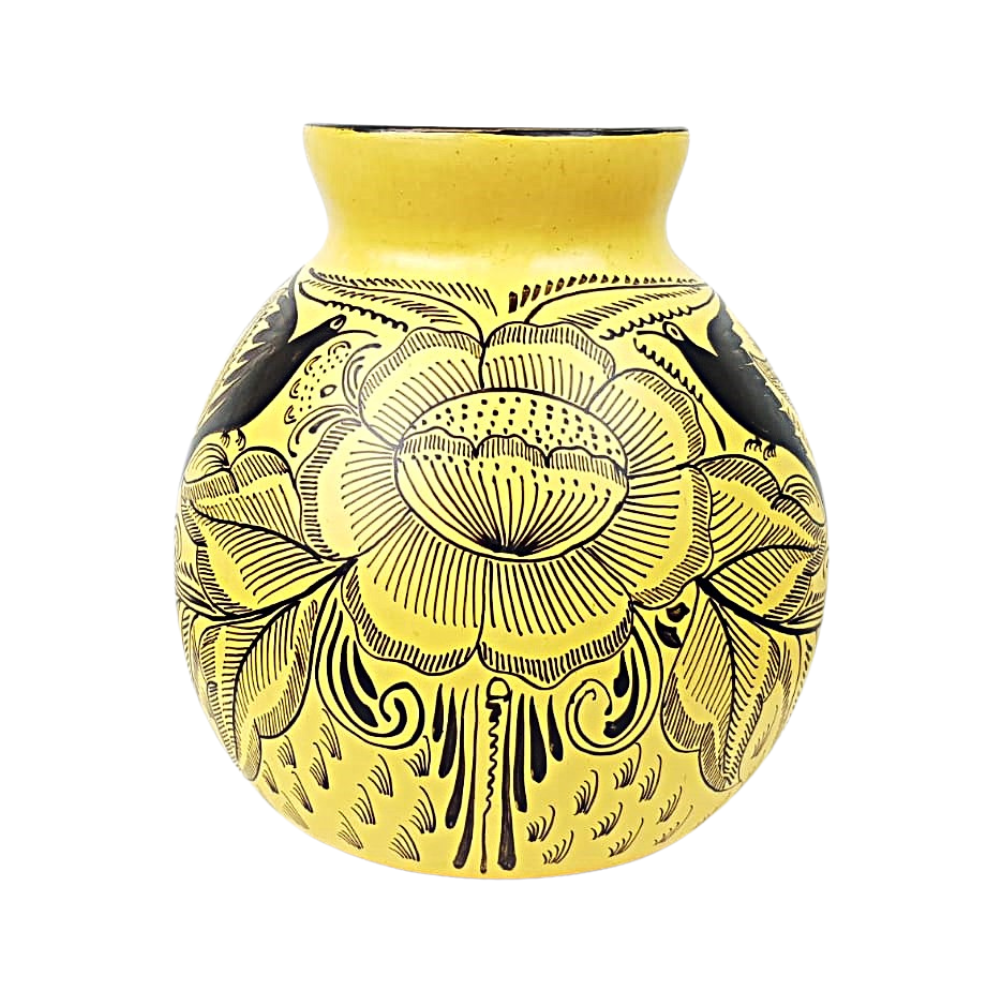 Florero mediano de barro bruñido decorado con flores y pájaros