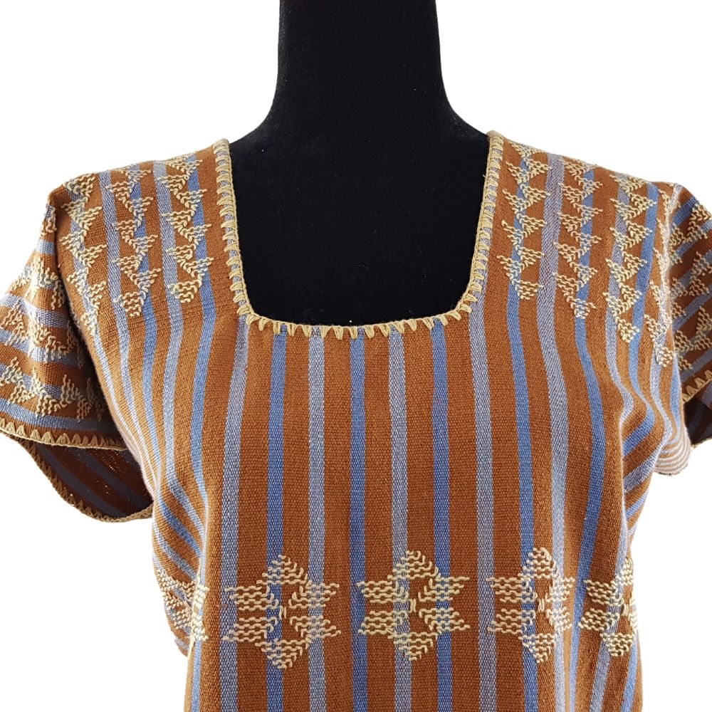 Hermoso huipuil eleborado por la artesana Ricarda García, quien dirige un colectivo en la zona mixteca de San Juan Colorado Oaxaca. Ricarda y su grupo se especializan en tejer en el telar de cintura, con hilos industriales o de algodones nativos, sus trabajos más hermosos y elaborados son aquellos en donde los hilos se han teñido con tintes naturales empleando cortezas de árboles, raíces, plantas y frutos.