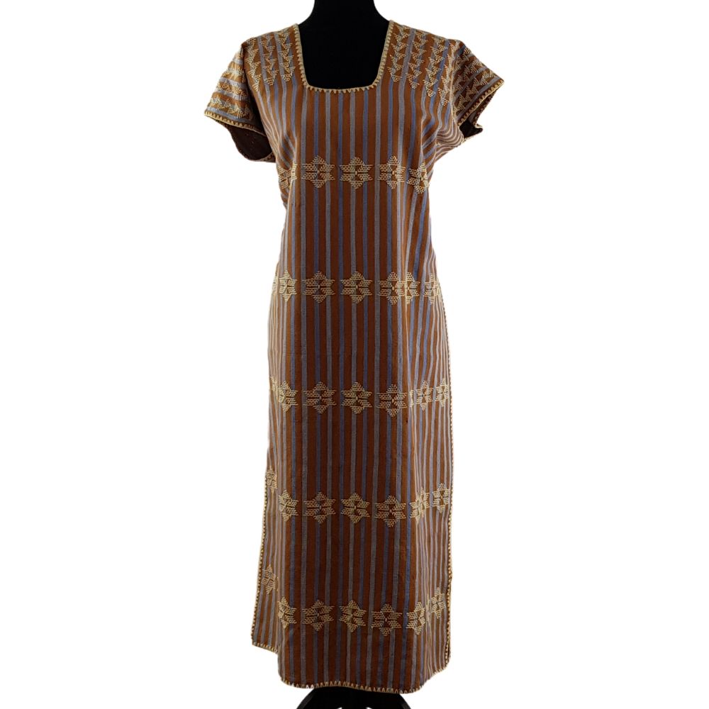 Este huipil fue realizado en telar de cintura con algodón teñido con tintes naturales, y lo decoran hermosos brocados también realizados en el telar, que le dan una textura punteada de estilo propio.
