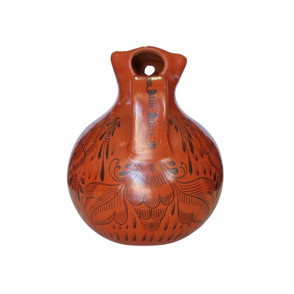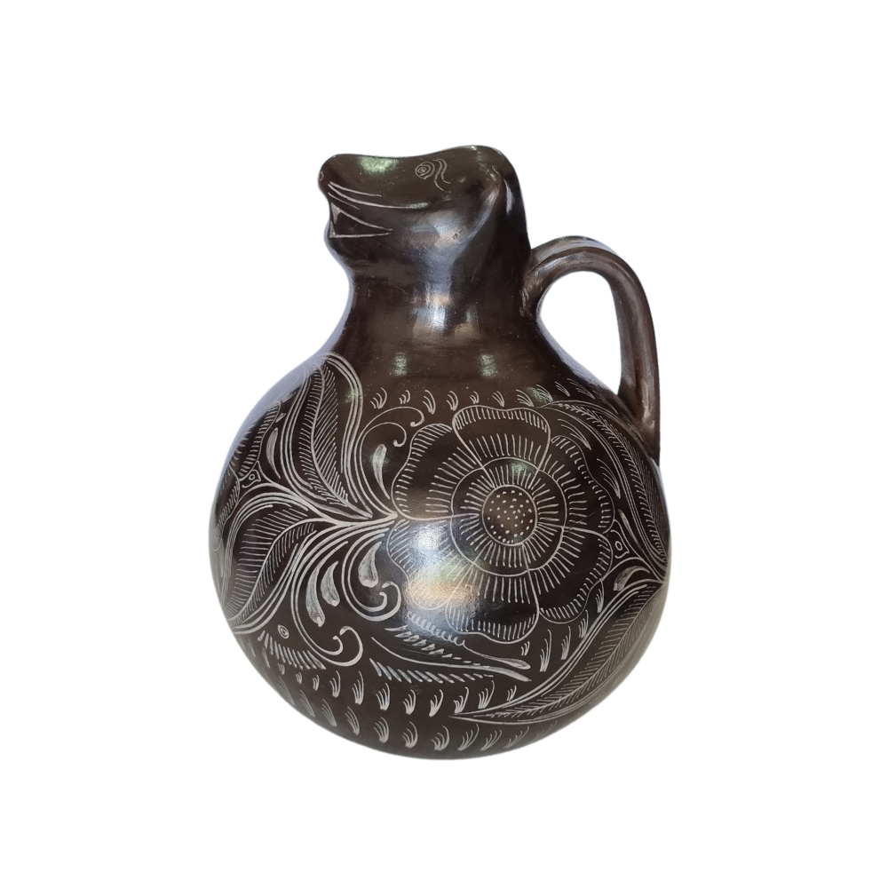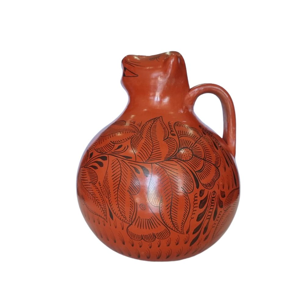 Jarra animalito para agua mediano de barro bruñido decorado con flores y pájaros