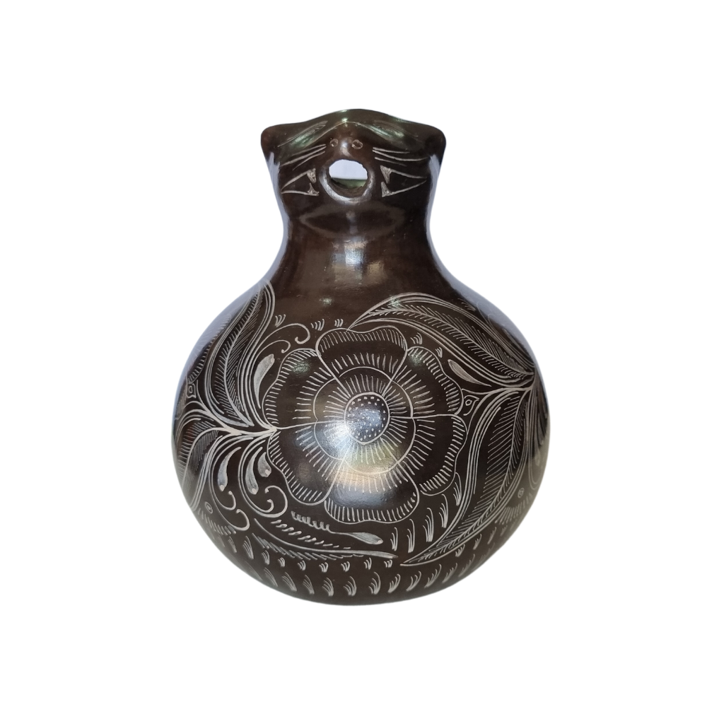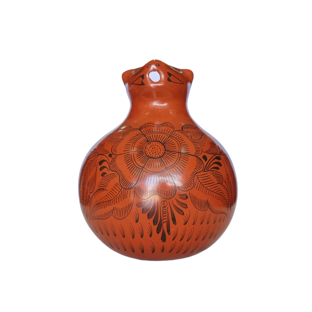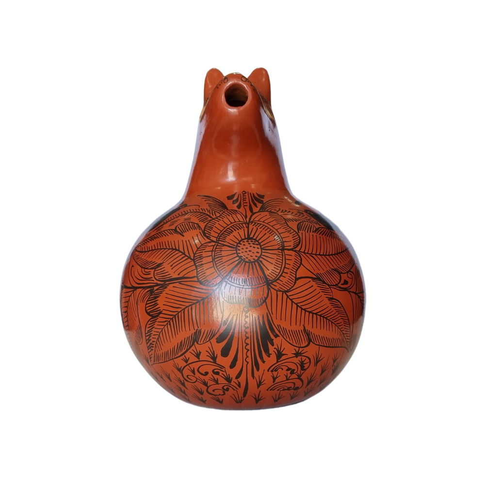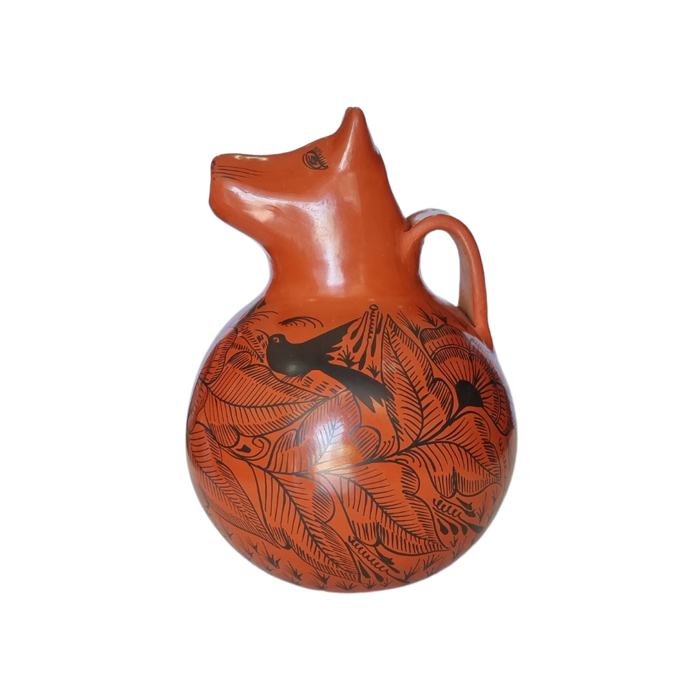 Jarra de barro bruñido con forma de animalito decorada con flores y pájaros. Esta artesanía mexicana es realizada por la maestra Bernardina y su familia en Huáncito, Michoacán.