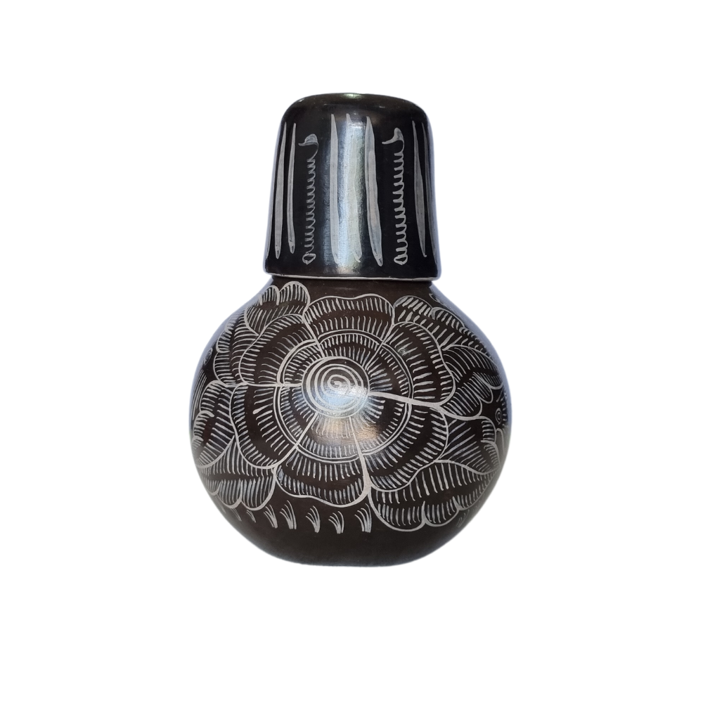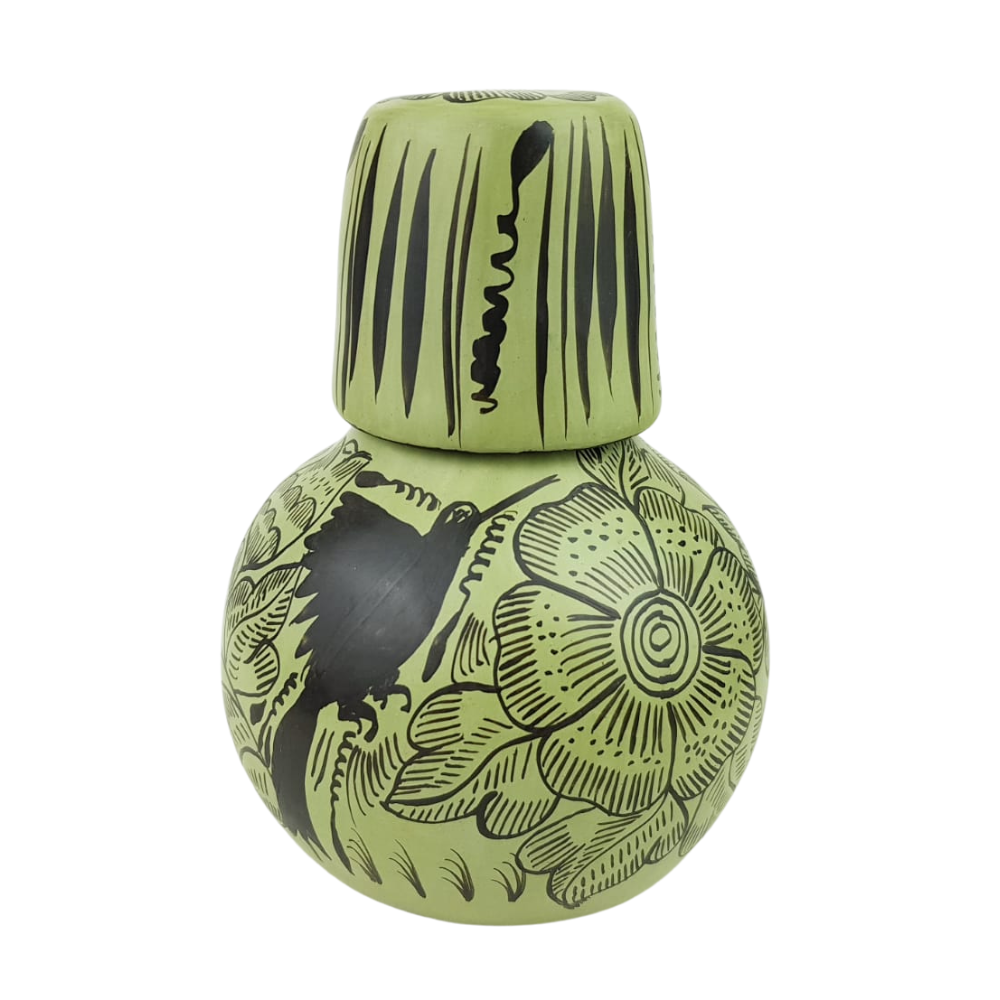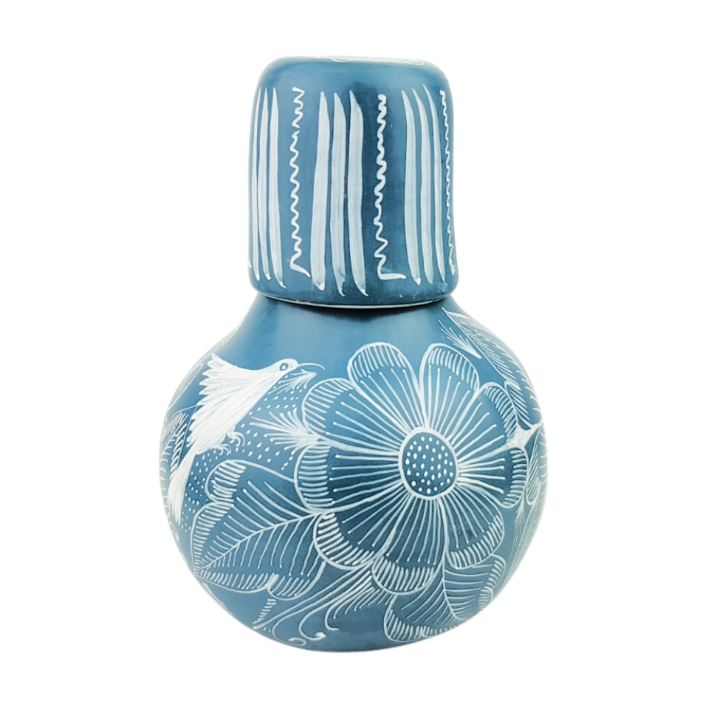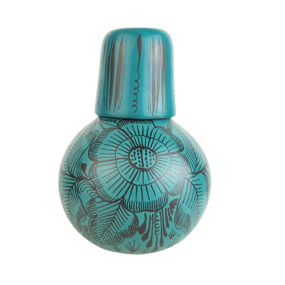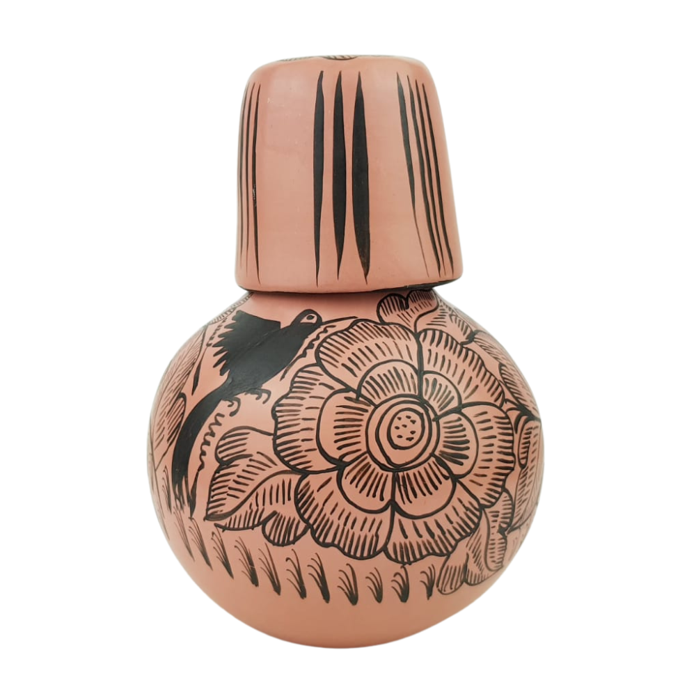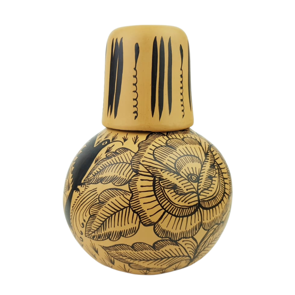 Una artesanía de Michoacán ideal para para dar un toque muy mexicano a tus espacios. Este hermoso botellón puede ser usado en tu decoración o para almacenar agua, cuenta con un vaso que también sirve de tapa, y en el cual puedes servirte y tomar agua fresca con un rico saber a barro.