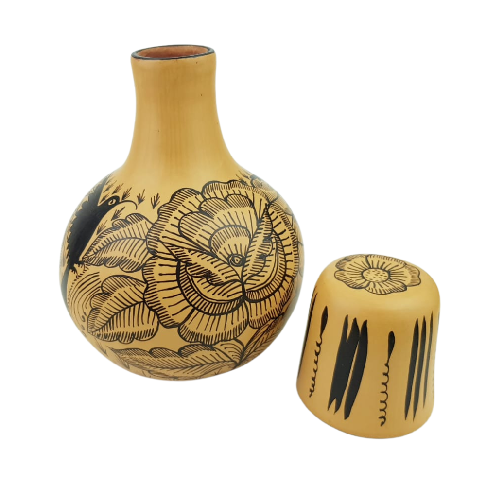 Botellón mini de barro bruñido decorado con flores y pájaros. Esta artesanía mexicana es realizada por la maestra artesana Bernardina Rivera y su familia en Huáncito, Michoacán.