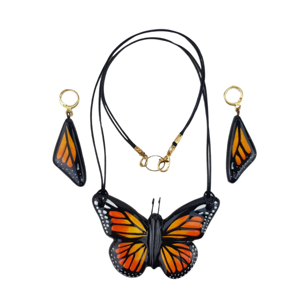 La familia Jimón es una de las más conocidas incluso internacionalmente por la calidad de sus piezas y su larga trayectoria. Este juego de bisutería además de tener el valor artesanal, el que sea inspirado en las mariposas monarca le da un sentido de identidad y pertenencia muy alto.