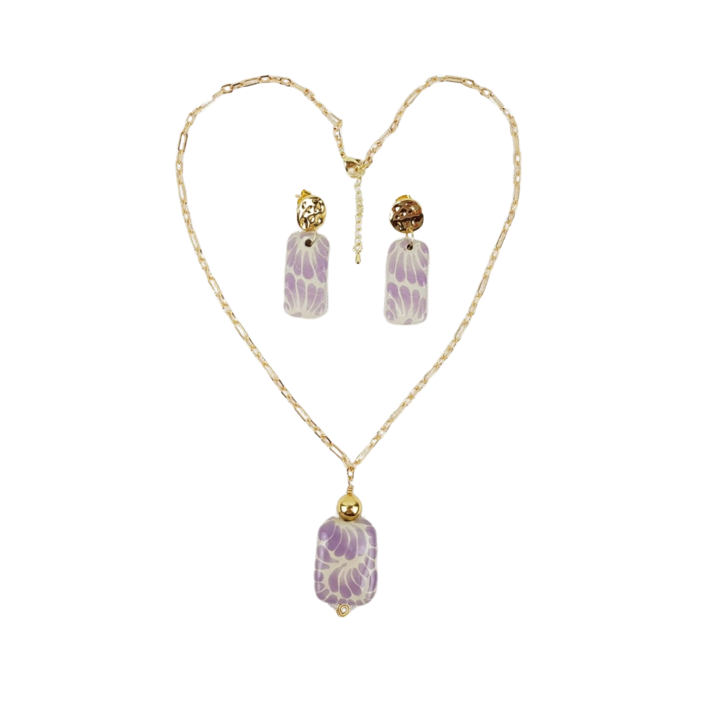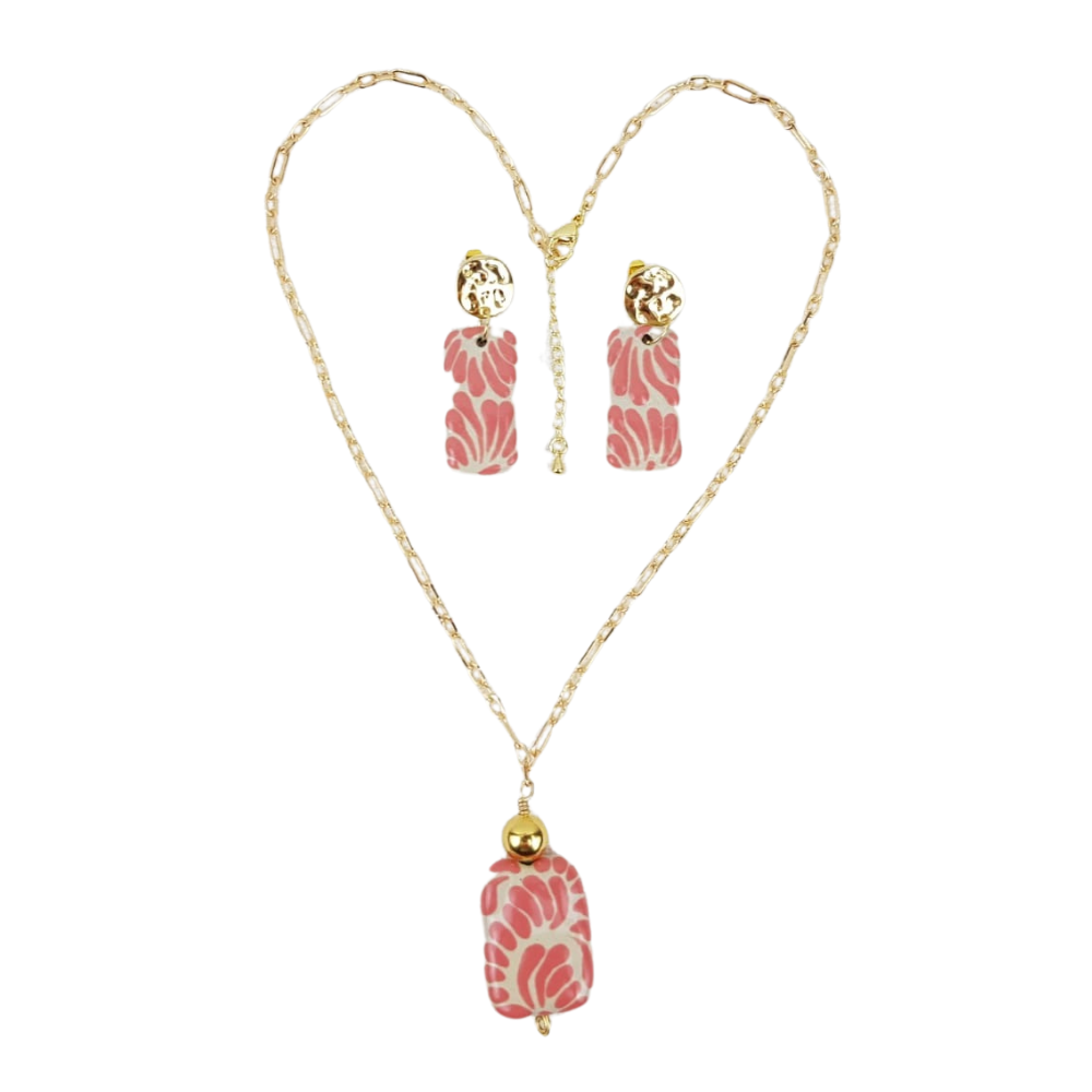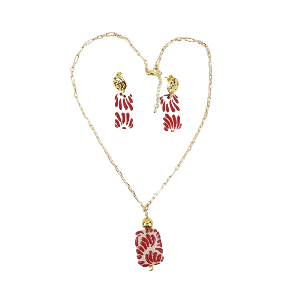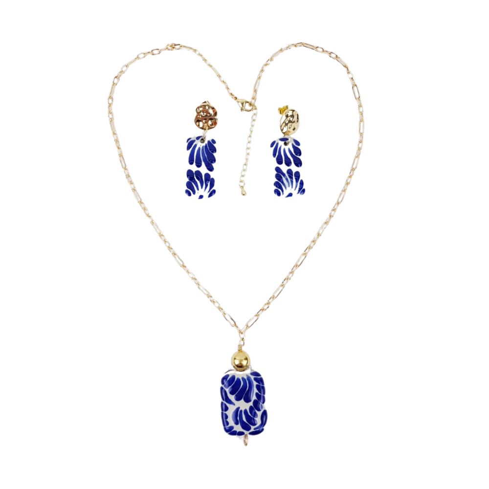 Juego de bisutería elaborado con técnica talavera, por Jasiel Anahí López Ornelas en Guadalajara, Jalisco. Estos juegos de bisutería son elaborados con molde, pero pintados cuidadosamente a mano.