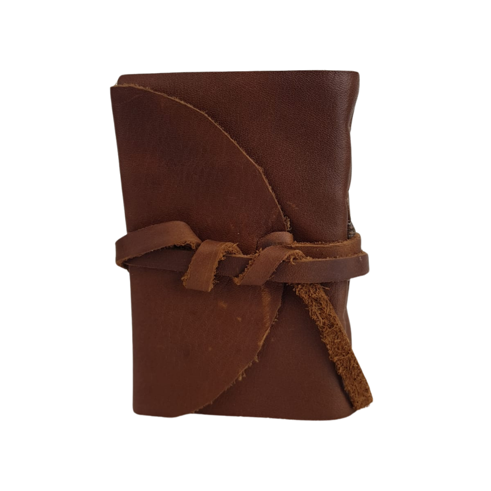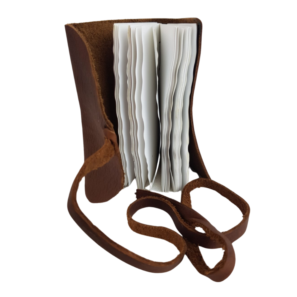 Libreta con hojas de papel piedra y forro de piel costurada a mano