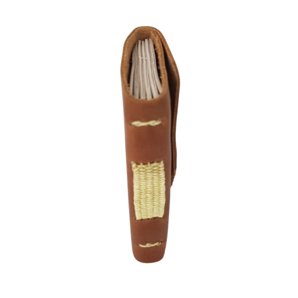 Libreta de bolsillo con hojas de papel reciclado y forro y correa de piel costurada a mano