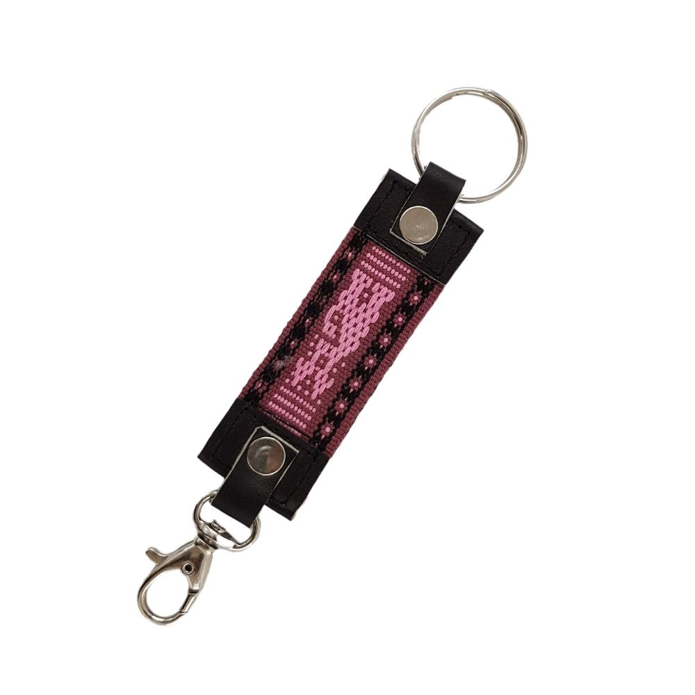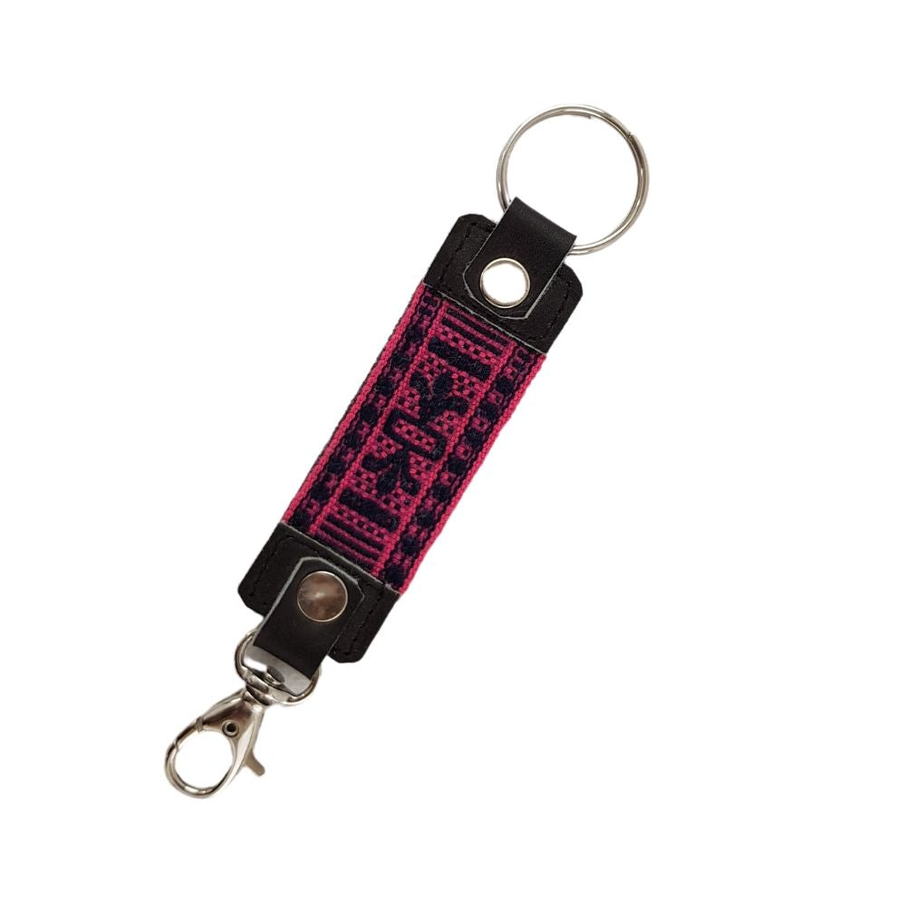 Llavero de piel decorado con fino textil tejido con hilos de algodón en telar de cintura. Cada hilo ha sido entrelazado en el telar de cintura para decorar este llavero. Un hermoso trabajo de Santo Tomás Jalieza Oaxaca, realizado por colectivo Unión de Artesanos.