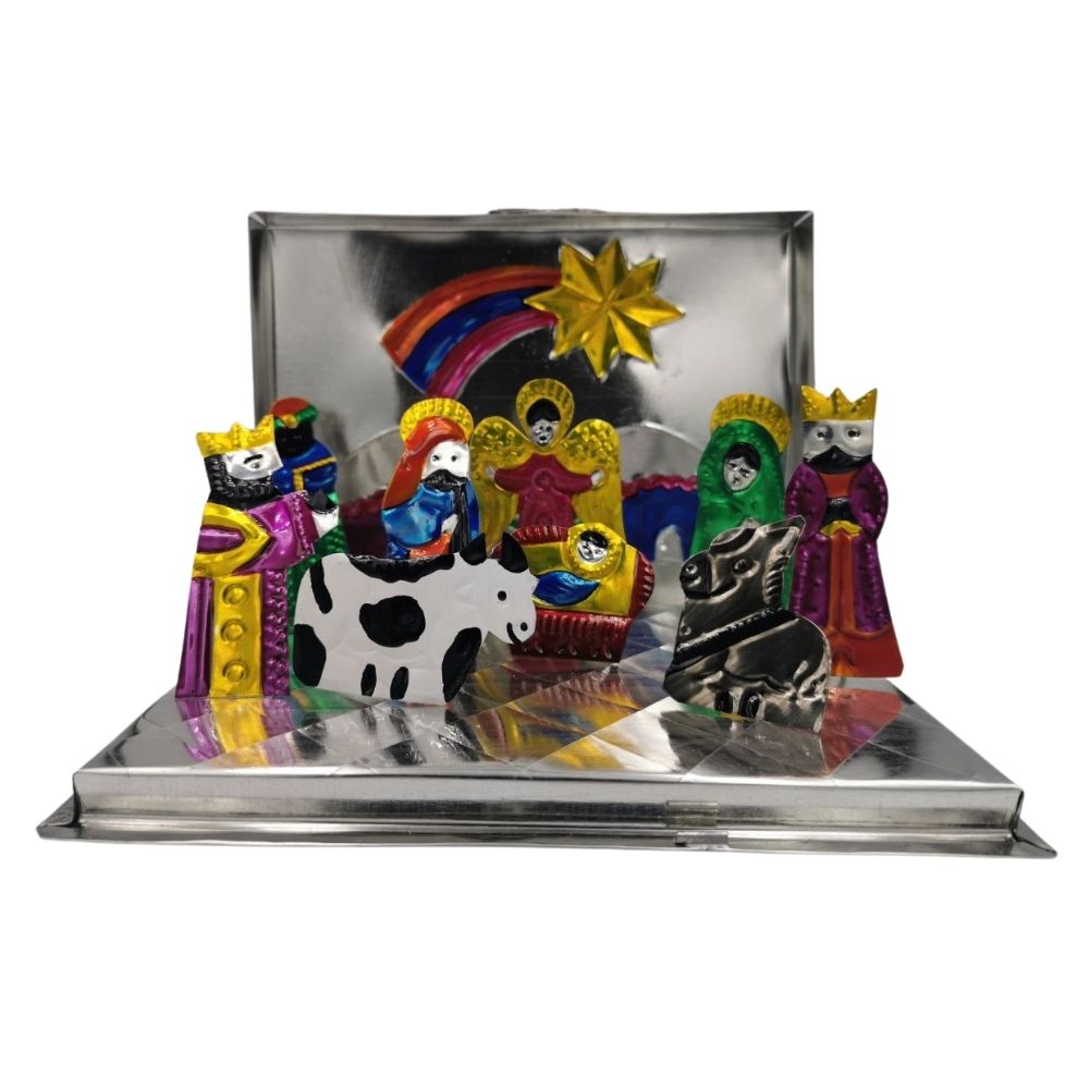 El nacimiento incluye: José, María, el niño dios, los tres reyes magos, un angelito, una vaquita, y una mulita. Todo dentro de un libro de hojalata decorado con pesebres y estrella.