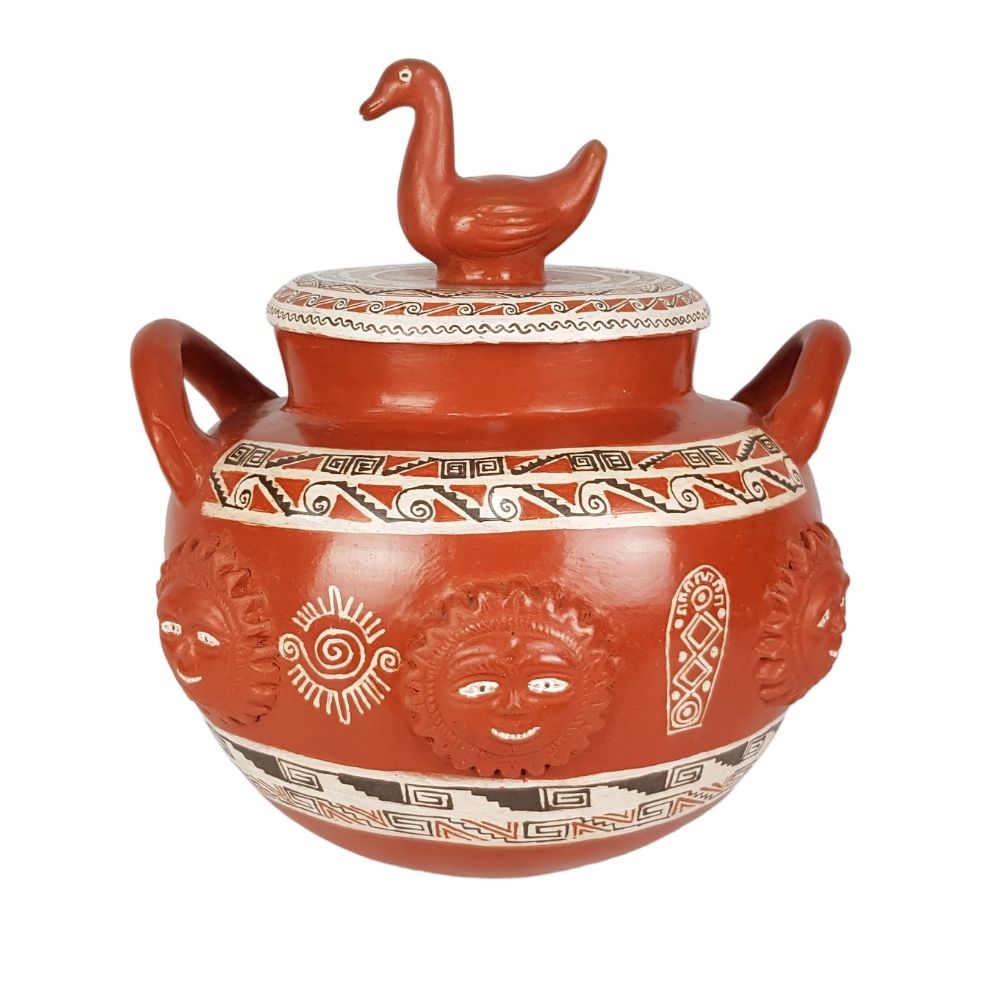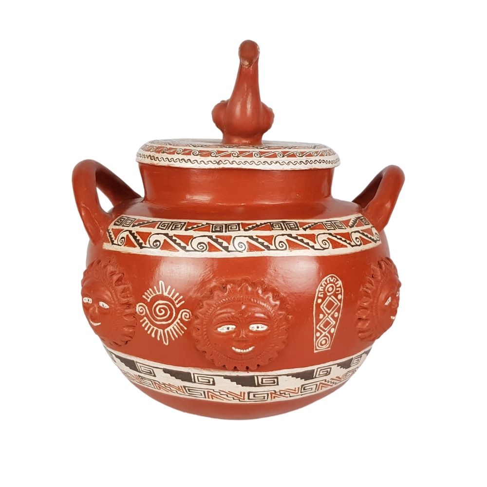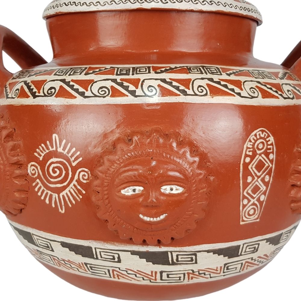Olla de soles de barro bruñido decorado a mano con motivos prehispánicos