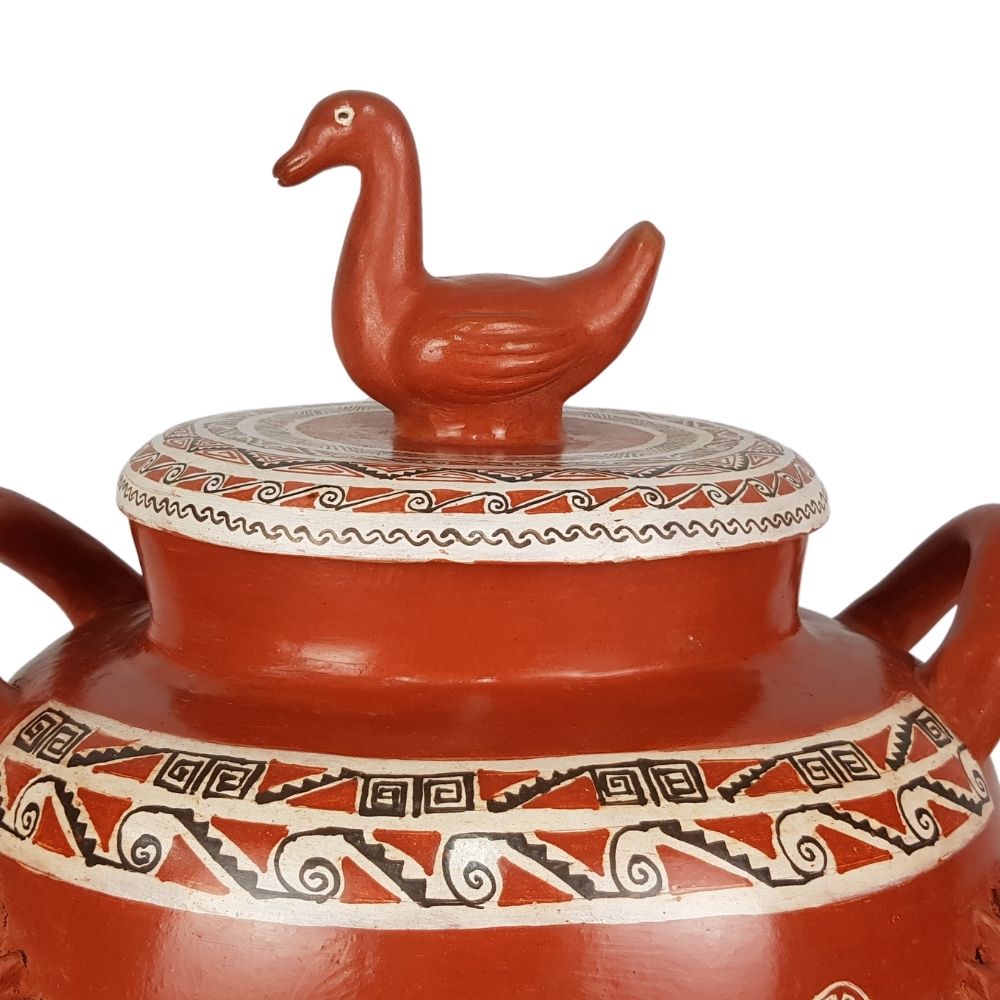 Olla decorativa con soles y tapa de pato elaborada a mano con la técnica de barro bruñido. Este trabajo fue realizado en Tzintzuntzan por el maestro artesano Maurilio Molinero, y fue totalmente decorada a mano con motivos prehispánicos que se aprecian en la zona arqueológica las Yácatas.
