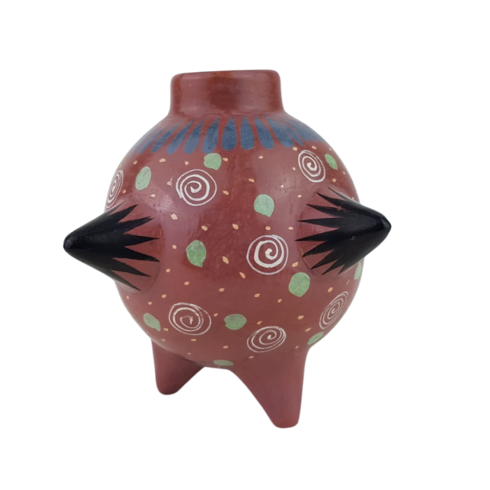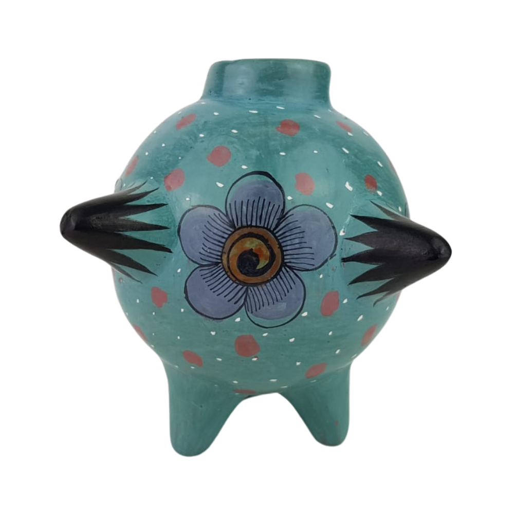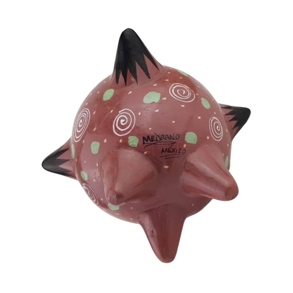 Bella piñata hecha artesanalmente con la técnica de barro bruñido, en Tonalá, Jalisco, por el artesano Jesús Díaz. La técnica del bruñido consisten en darle brillo a la pieza por medio del tallado con una piedra de rio u otra pieza de superficie lisa. No se usan lacas para su acabado.