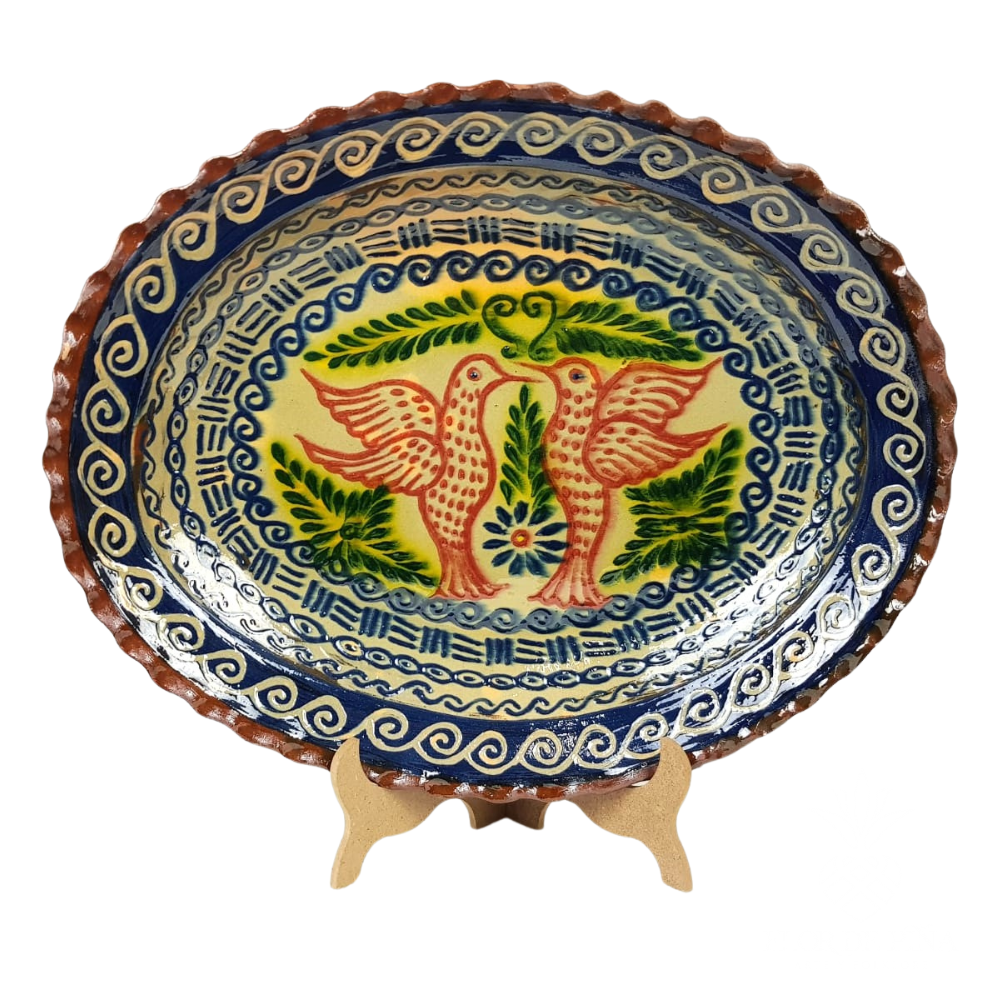 Plato de barro decorado con pájaros y grecas. Esta artesanía mexicana fue realizada por maestros artesanos de Tzintzuntzan, Michoacán, y fue presentada en el XXV Concurso de Artesanías de Tzintzuntzan celebrado en el Ex-convento de Santa Ana en Febrero de 2020.